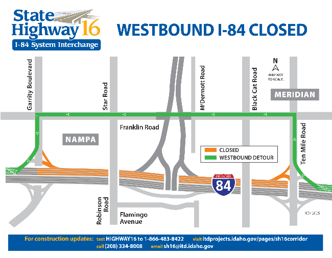 NAMPA - The Idaho Transportation Department will detour westbound Interstate 84 traffic at night between Ten Mile (Exit 42) and Garrity (Exit 38) from Thursday to Monday.