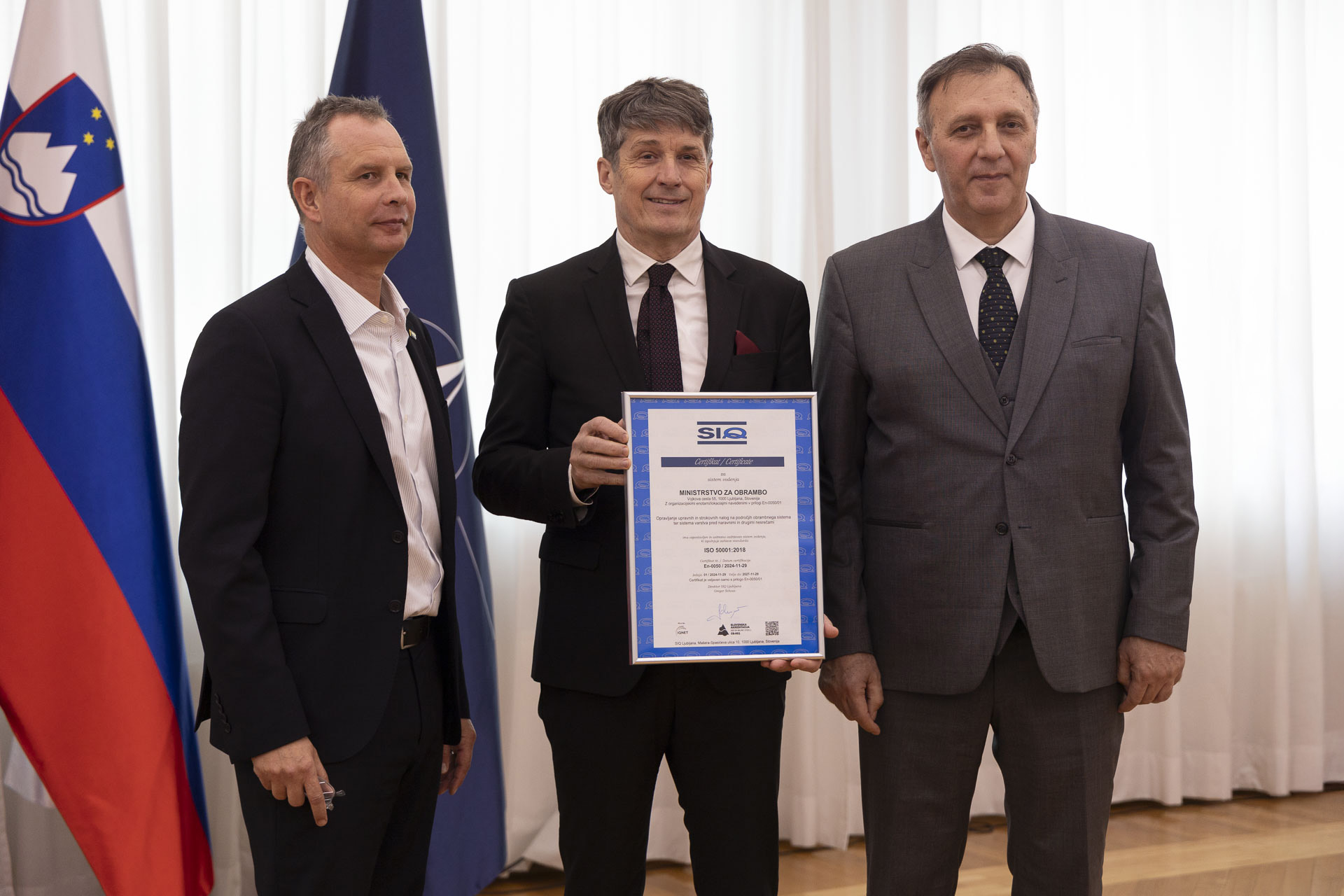 Direktor Slovenskega instituta za kakovost in meroslovje SiQ Gregor Schoss je povedal, da je institut po obsegu delovanja danes med desetimi največjimi tovrstnimi certifikacijskimi organi v Evropi oziroma med dvajsetimi na svetu. Nastal pa je prav s ciljem preizkušanja vojaških komponent, saj je pred dobrega pol stoletja vojska želela posebej odporne, trajnostne in kakovostne izdelke. Direktor Gregor Schoss je izpostavil dobro sodelovanje z ministrstvom, katerega eden od rezultatov je pridobitev navedenega certifikata. Tega ima v državi manj kot sto poslovnih subjektov in kot edino obrambno ministrstvo, pri čemer certifikat pokriva izjemno velik spekter delovanja ministrstva. Direktor SIQ je poudaril, da je bila podelitev certifikata posledica zahtevnega in dlje časa trajajočega procesa: »Certifikat je priznanje vodstvu in zaposlenim ministrstva za predanost kakovosti, organiziranosti in predvsem viziji, pri kateri ne pozabljate na napredne tehnologije in organizacijska vprašanja.«