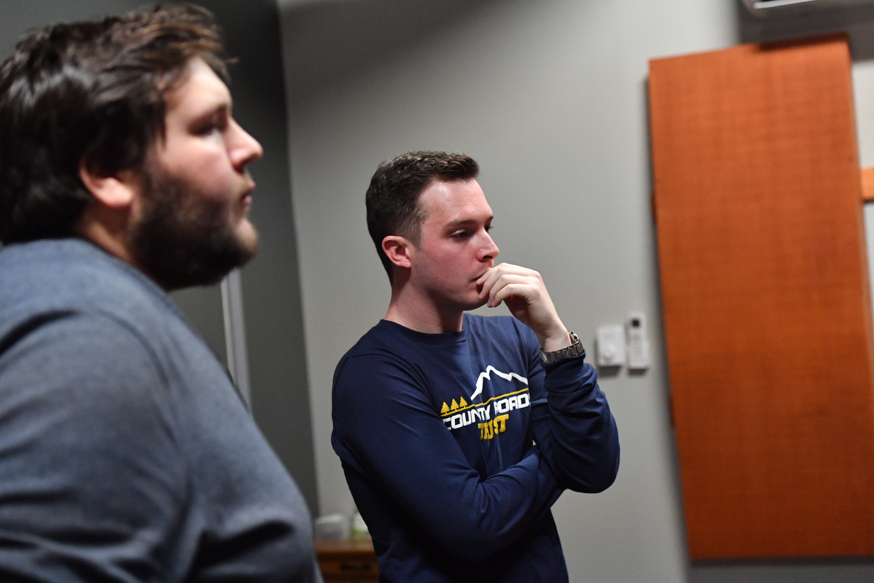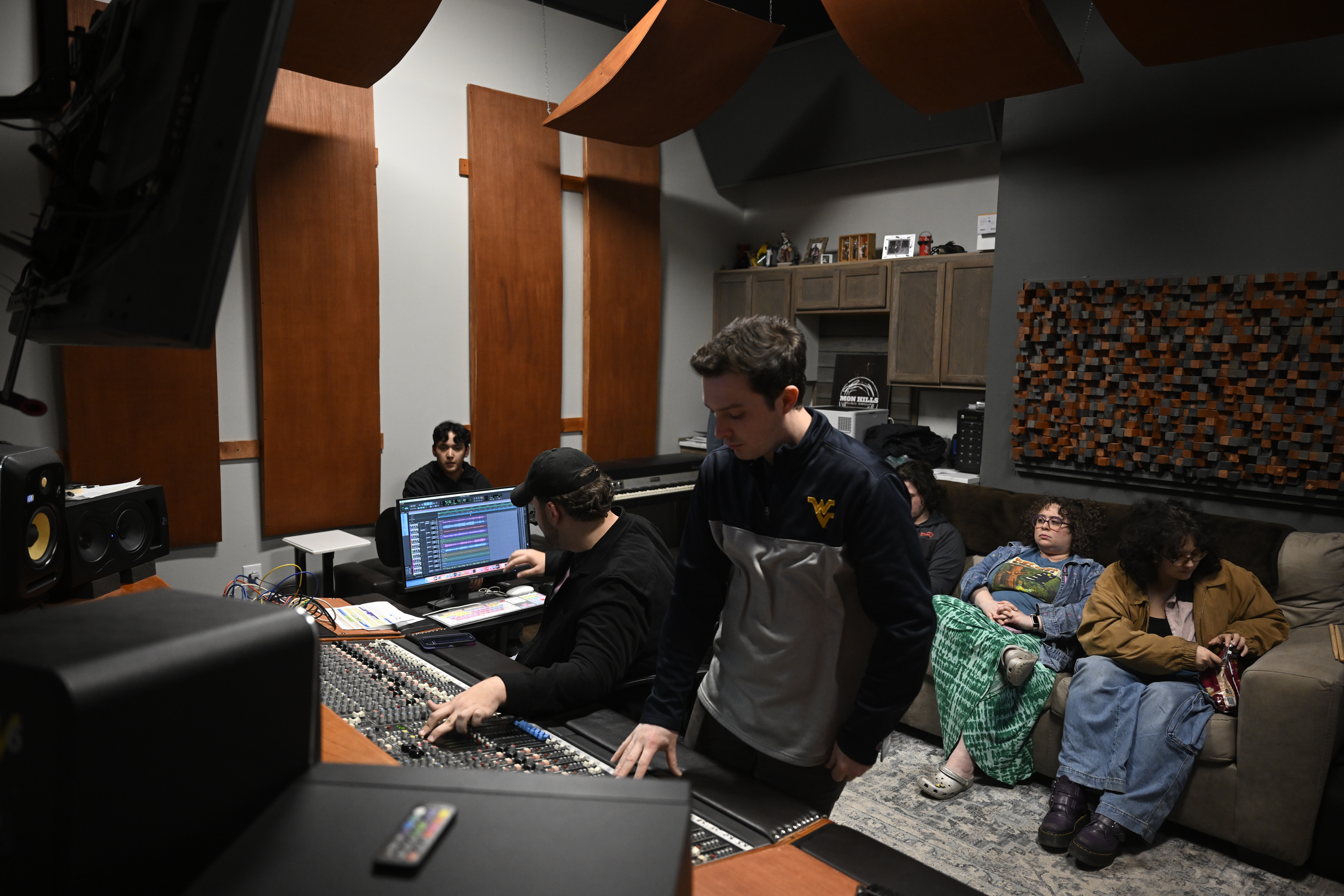 Justice regularly works with students during recording sessions in the Mon Hills recording studio and is able to expand their experiential learning with his real world knowledge. (WVU Photo/David Malecki)