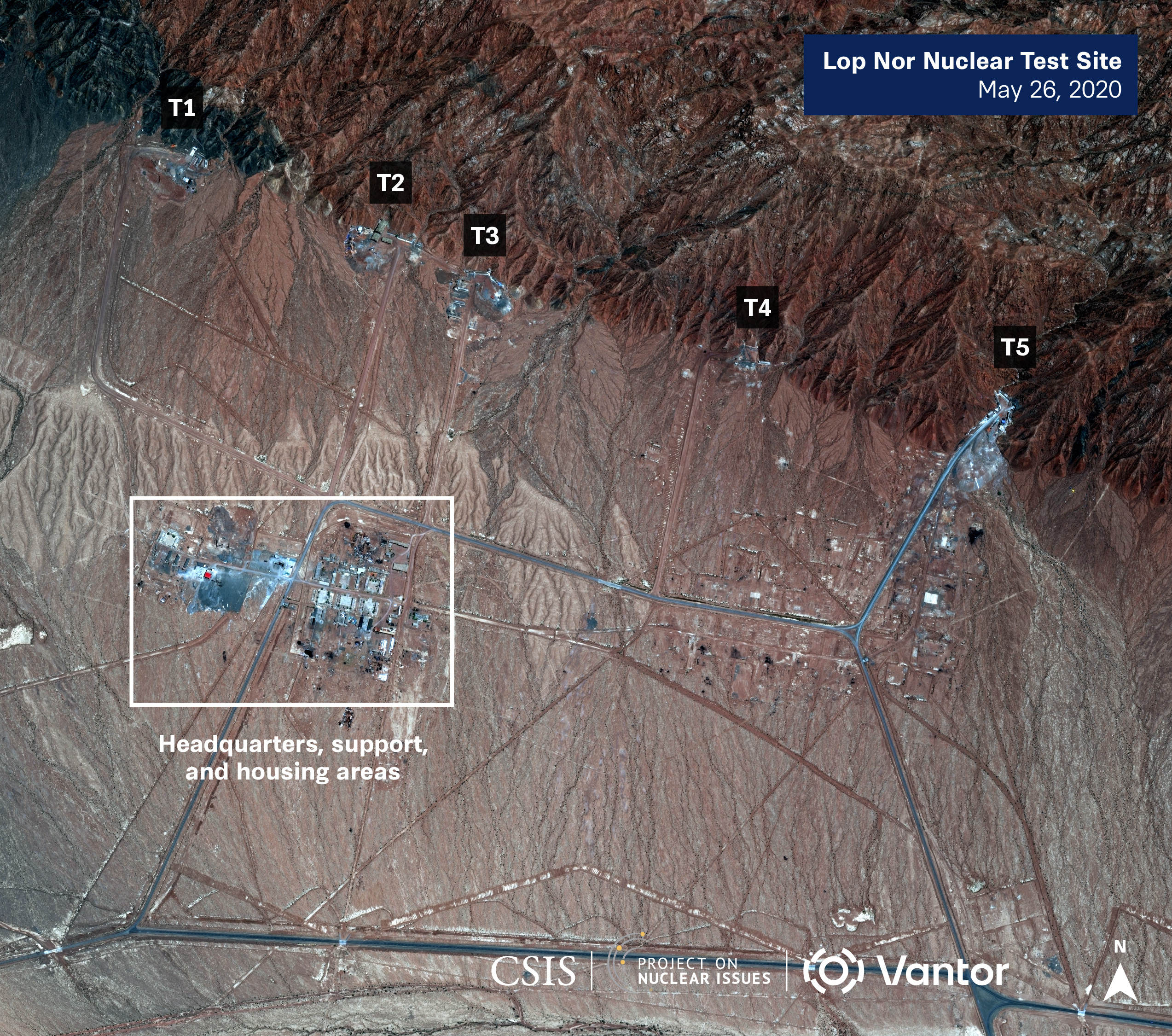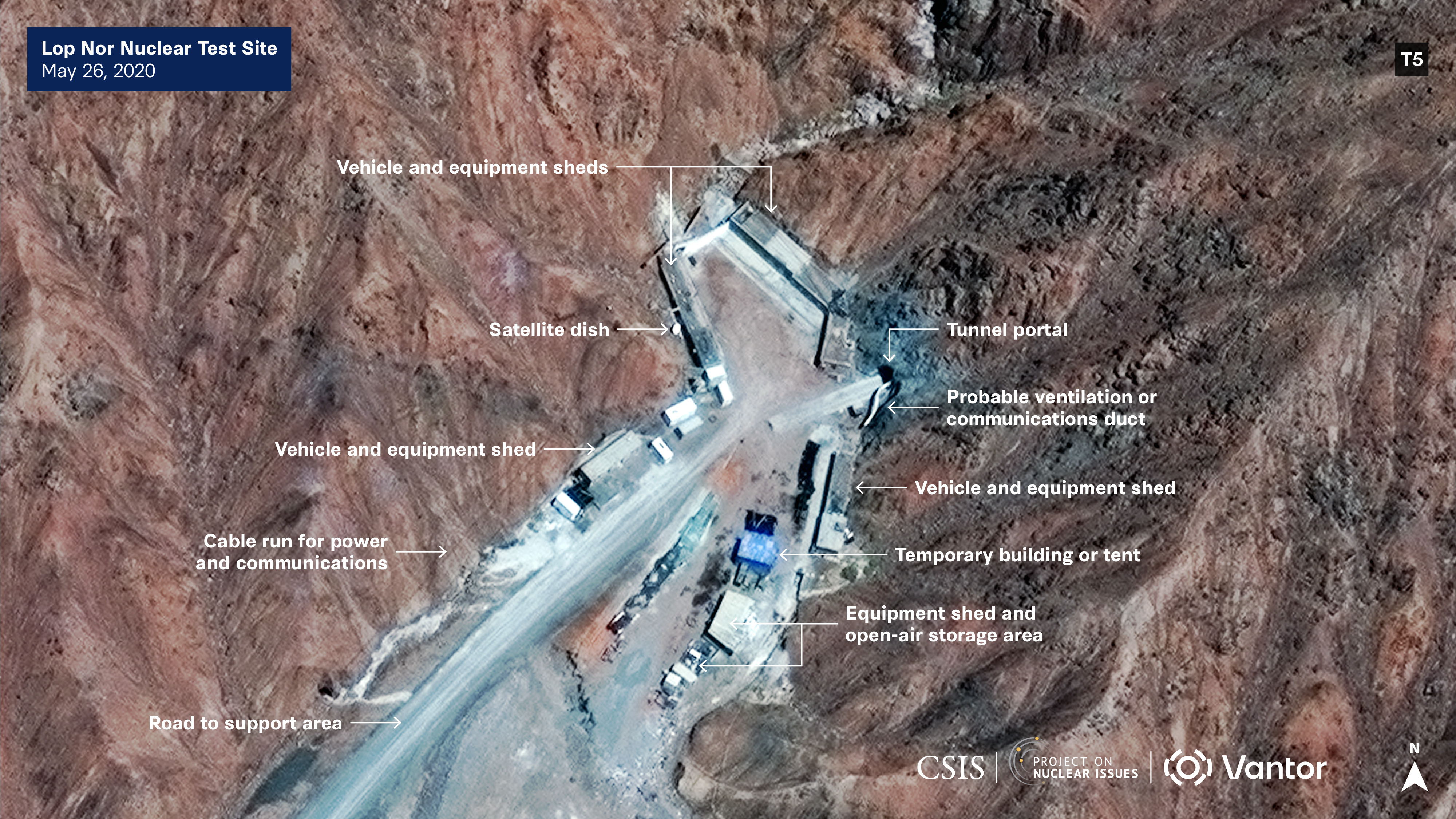 While commercially available imagery of Lop Nur during this timeframe is limited, CSIS analyzed Vantor images from March 26, 2020, and June 25, 2020, of the northern tunnel test area. Before China's testing moratoria, China reportedly conducted underground nuclear tests with explosive yields of less than 10 kilotons in this area. Analysts have noted significant activity at Tunnel 5 since 2020. CSIS imagery analysis of Lop Nur's northern test tunnel area, including Tunnel 5, saw no significant activity or changes between March 26, 2020, and June 25, 2020. However, Lop Nur is a large facility. It is possible that China conducted an underground nuclear test at another area. It is also possible that the testing did indeed take place at this tunnel, and there are no optical indicators in these two images.