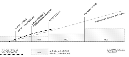 La visibilité signalée au sol était inférieure à la visibilité recommandée par le CAPFootnote 6. Cependant, les feux stroboscopiques d'identification de piste ou de prolongement dégagé ont été visibles entre 1 et 1,5 DME. Le commandant de bord a alors effectué une transition au vol à vue et a demandé que le réglage des volets soit augmenté de 20 à 35 degrés. À ce moment-là, l'avion se trouvait entre 1200 et 1300 pieds asl, soit entre 200 et 300 pieds au-dessus de l'altitude minimale de descente de l'approche, et à une distance approximative de 0,3 à 0,8 mille marin (nm) du point d'approche interrompue. Lorsque le VASIS est devenu visible à environ 1000 pieds du seuil de piste, il affichait quatre feux blancs, ce qui indiquait que l'avion était au dessus de la trajectoire de descente optimale pour un atterrissage normal. À ce moment-là, l'avion était à 500 pieds agl. Dans une tentative visant à regagner la trajectoire de descente optimale par rapport au VASIS, la puissance des moteurs a été réduite et l'angle de descente s'est accru. La vitesse indiquée a augmenté de 132 à 137 nœuds.