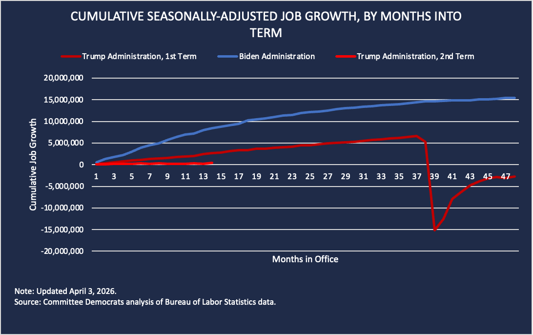 "One of the traditional measures of the success of the economy has always been the number of jobs created. By this point in their respective terms, President Biden created 8.5 million jobs with average monthly gains of 604,000 jobs compared to 369,000 total jobs with average monthly gains of 26,000 jobs during President Trump's second term. These differences underscore the impact of President Trump's disastrous policy choices.