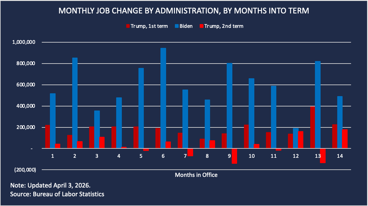 To see a chart comparing the cumulative seasonally adjusted job change by month between President Trump's first and second terms, and President Biden's presidency, click here.