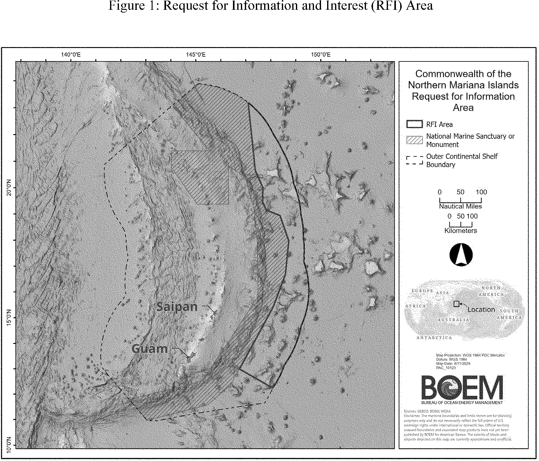 The CNMI is an unincorporated territory and commonwealth of the United States located in the northwestern Pacific Ocean and includes the 14 northernmost islands of the Mariana Archipelago. The RFI Area is located west of the Mariana Trench National Monument along the eastern edge of the U.S. Exclusive Economic Zone (Northern Mariana Islands). This area is approximately 35,483,044 acres (143,595 km 2 ) with an approximate water depth of 3,700-25,100 feet (1,130-7,650 meters) and lies entirely within the OCS offshore the Commonwealth of the Northern Mariana Islands. The southern boundary of the RFI Area is approximately equal distance between the islands of Guam and Rota, the southernmost island of the CNMI. The RFI Area consists of abyssal plain, seamounts, and guyots and includes 6,502 whole or partial OCS lease blocks. The closest distance from Saipan to the RFI Area is approximately 128 statute miles (206 kilometers). BOEM plans to refer to Official Protraction Diagrams, whole or partial OCS lease blocks, and aliquots for the purpose of area identification and tract size specification. This is consistent with previous RFIs issued related to OCS mineral lease sales and the practice used by BOEM for other OCS leasing ( e.g., oil and gas, other minerals). The map depicting the RFI Area (Figure 1), a spreadsheet listing its specific OCS blocks, and an Esri shapefile are available for download on the BOEM website at: www.boem.gov/Northern-Mariana-Islands.