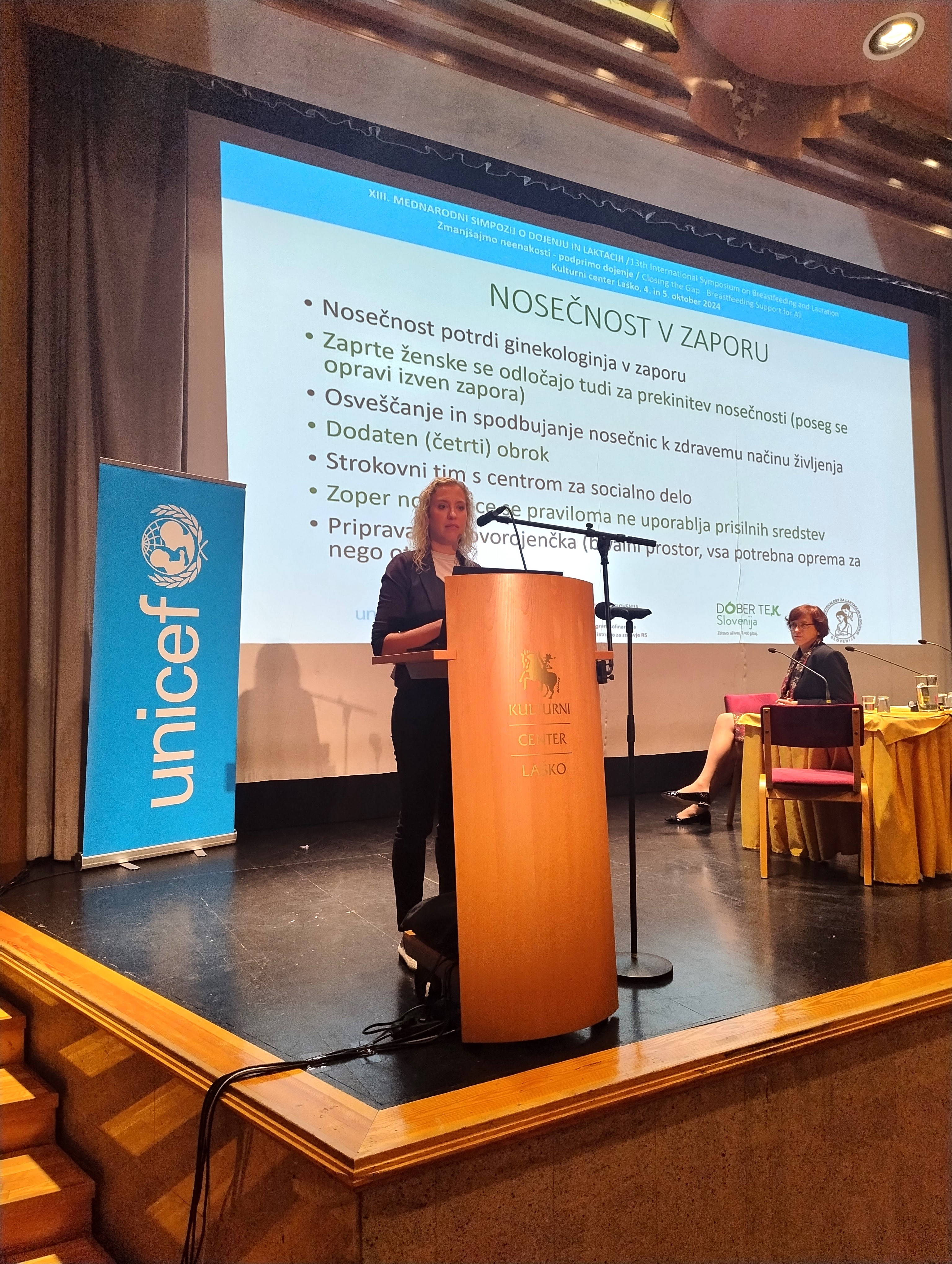 V mesecu oktobru smo s prispevkom na temo materinstva v zaporu sodelovali tudi na trinajstem mednarodnem simpoziju o dojenju in laktaciji pod sloganom »Zmanjšajmo neenakosti - podprimo dojenje« v organizaciji Nacionalnega odbora za spodbujanje dojenja Unicef. Simpozij je potekal v Laškem, prispevek pa je v imenu ženskega zapora predstavila vodja Oddelka za vzgojo, Vesna Kopač. Letošnja ciljna skupina simpozija so bile ranljive skupine, v katero sodijo tudi zaprte osebe. Udeleženci dogodka so bili povečini zdravstveni delavci. Tema o materinstvu in dojenju v zaporu, ki je javnosti nekoliko manj znana, je pritegnila precejšnjo pozornost strokovne javnosti in spodbudila vprašanje kako omogočiti nosečnicam, materam in otrokom spodbudno okolje. Simpozija smo se udeležili z namenom, da se nagovori predsodke in stigmo, ki obstajajo v povezavi z zapori in zaprtimi osebami ter s tem poskušati širiti obzorja strokovnjakom s področja zmanjševanja neenakosti.