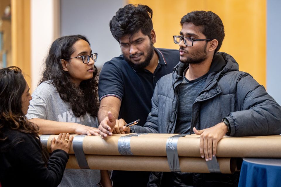 Launch SlideshowSchool of Science and Engineering students construct a bridge out of cardboard and duct tape during the SSE Innovation Challenge with industry partner TWM on November 13, 2024. Photo by Sarah Conroy.Fifteen teams of students competed in the event on Wednesday, Nov. 13. The challenge was won by a team comprised of Jaisri Akaram, Bharath Bandlamudi, Jahnavi Uppugandla and Abhilash Kurapati.