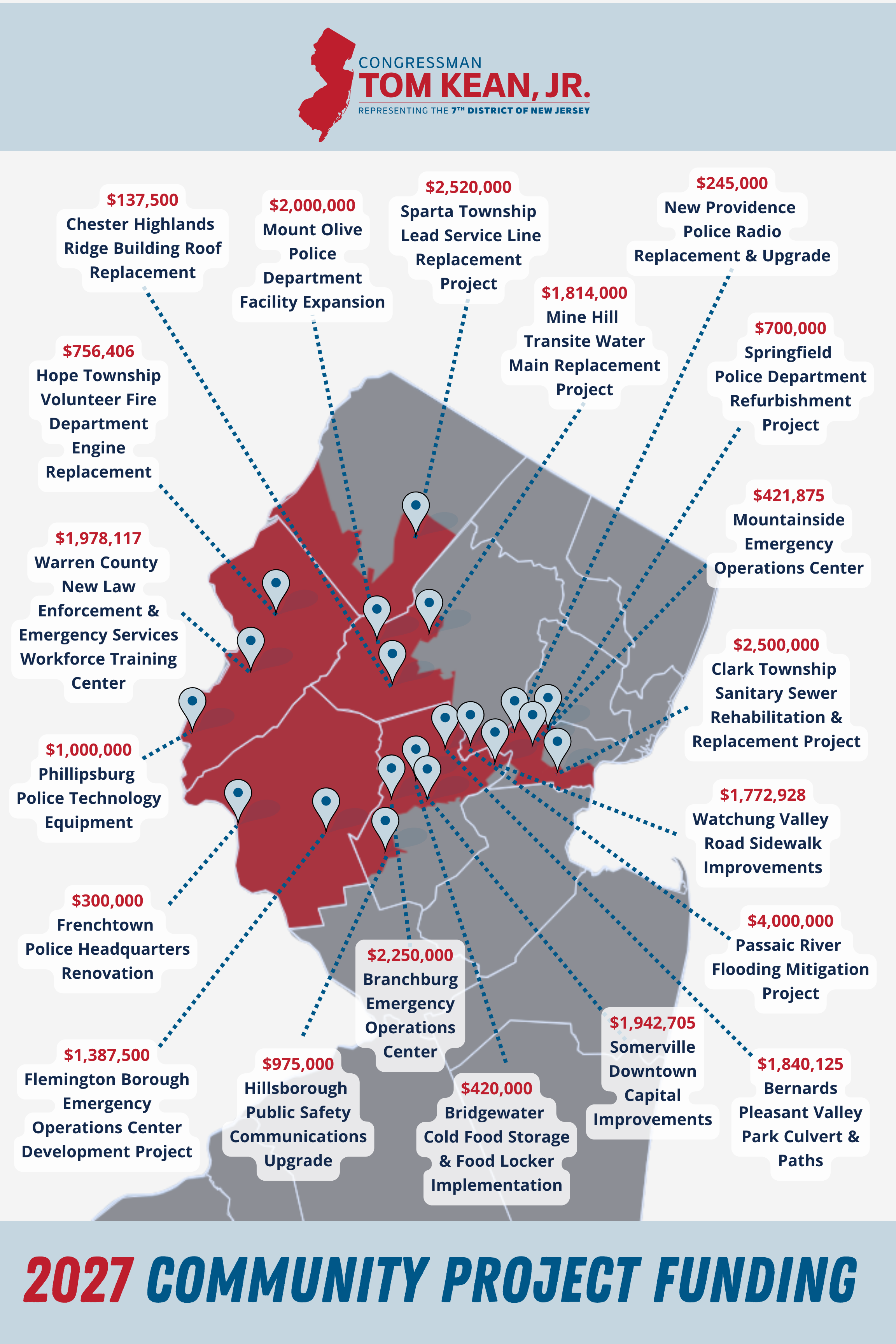 (April 9, 2026) WASHINGTON, D.C. - Today, Congressman Tom Kean, Jr. (NJ-07) announced that his office has submitted 20 Community Project Funding requests to the House Appropriations Committee for consideration ahead of the Fiscal Year 2027 congressional appropriations process. Each of the six counties in New Jersey's 7th Congressional District are represented in the selections below.