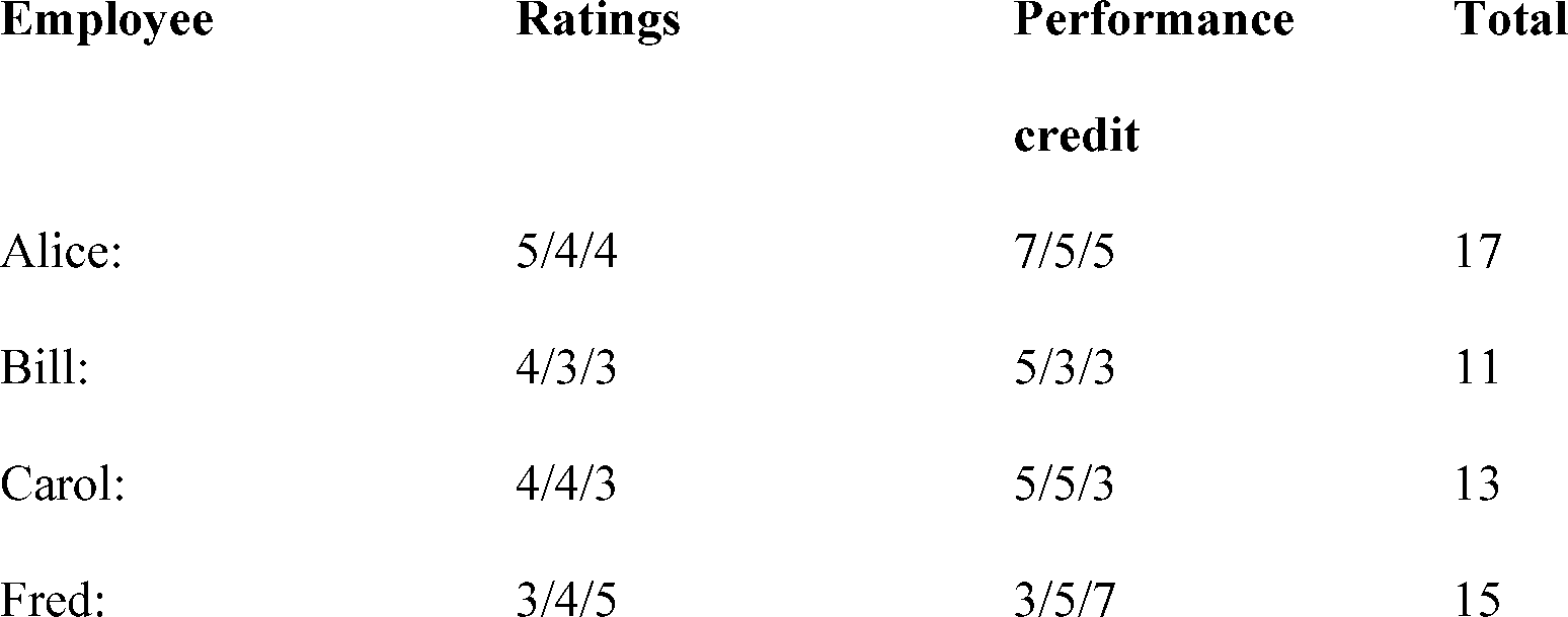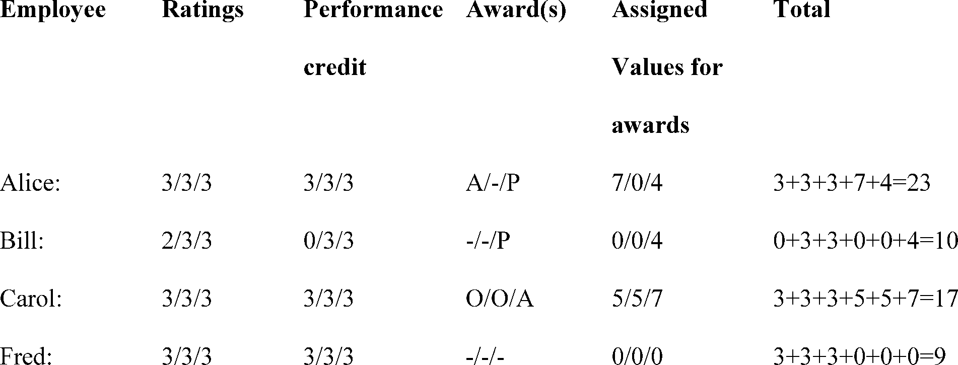 For example, the employees below are covered under a three-summary level pattern as described in 5 CFR 430.208(d). Their agency has an established policy of providing enhanced performance credit by assigning 7 points for agency awards, 5 points for organizational awards, and 4 points for various performance awards. (An agency award is designated by "A"; a component-level award is designated by "O"; and a performance award or QSI is designated by "P".) Their ratings and totals are: