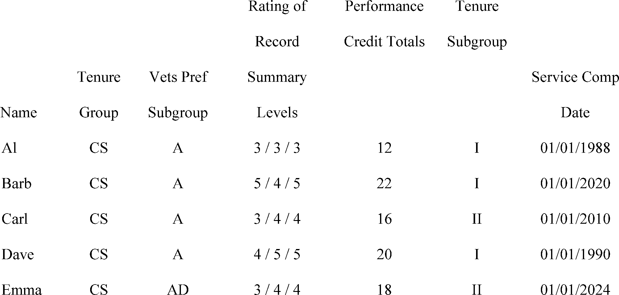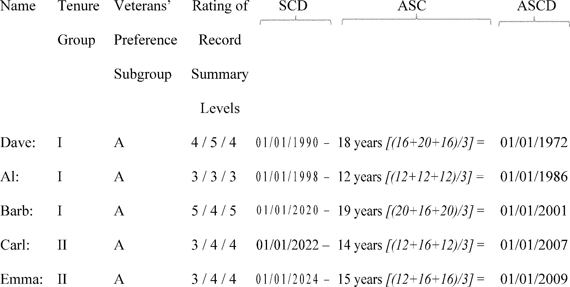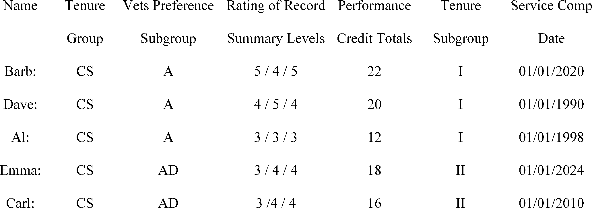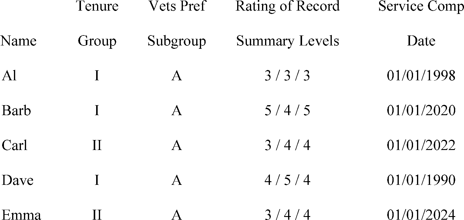 Under the current rules, a retention register constructed in 2018 for these employees would look like this, based on retention factors considered in this order: Tenure | Vets Pref | Adjusted Service Computation Date (ASCD)- i.e., the service computation date (SCD) adjusted for additional service credit (ASC) based on ratings of record summary levels: