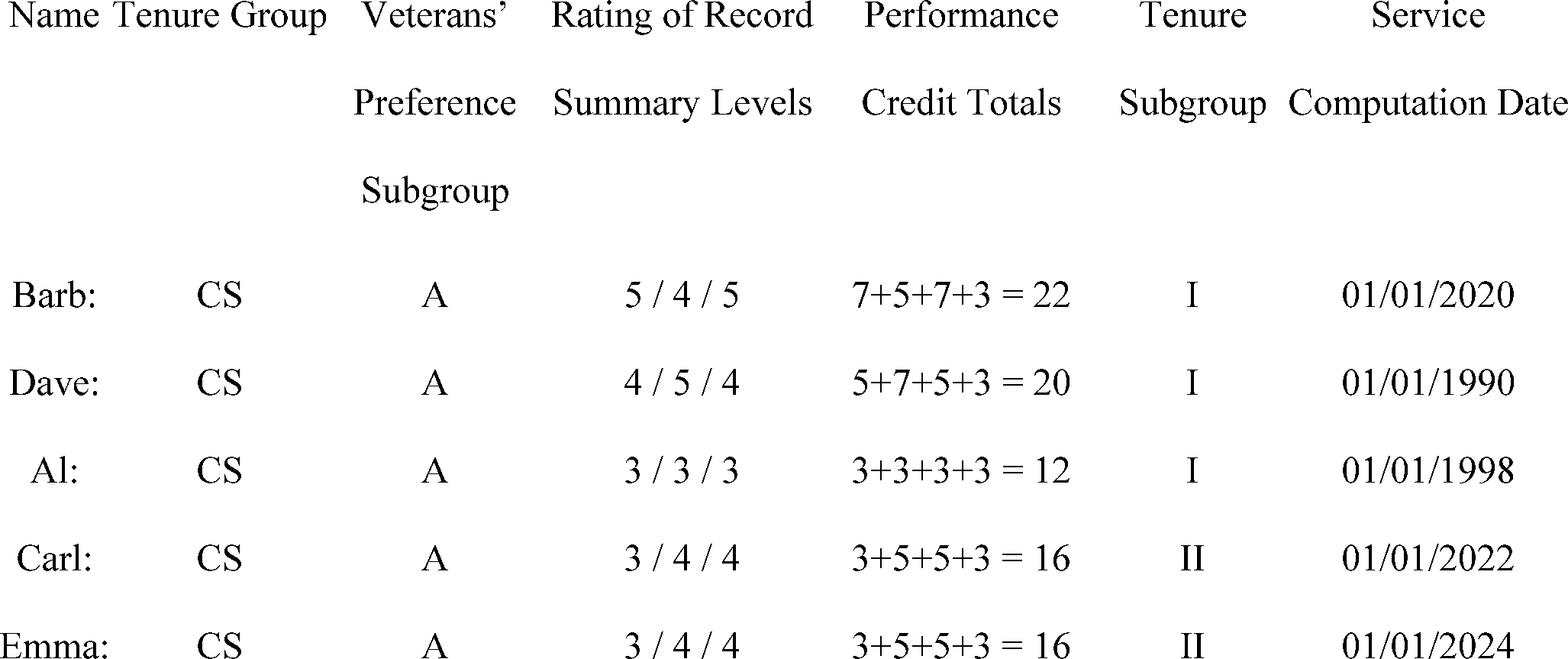 The following illustrates how veterans' preference and length of service apply under the proposed rules. Assume the same group of employees but with one difference: Emma receives additional performance credit based on status as a veteran with a compensable service-connected disability, as follows: