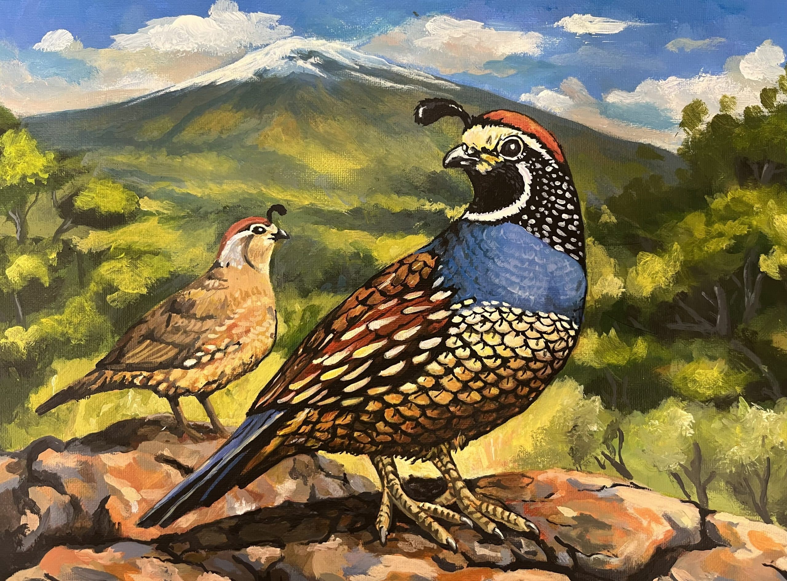 Game Bird Stamp Winner (Valley Quail): Alvin Galvez. The winning submission depicts male and female California Valley Quails proudly perched on a rocky outcrop, set against a sweeping mountain backdrop.