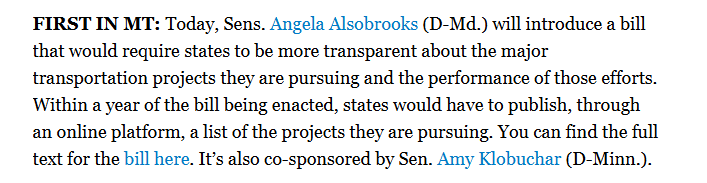 WASHINGTON, DC - As reported in Politico's Morning Transportation, Senator Angela Alsobrooks (D-Md.) introduced the Transportation Project Accountability Act of 2026, which would strengthen transparency, performance evaluation, and public reporting for major state transportation projects.