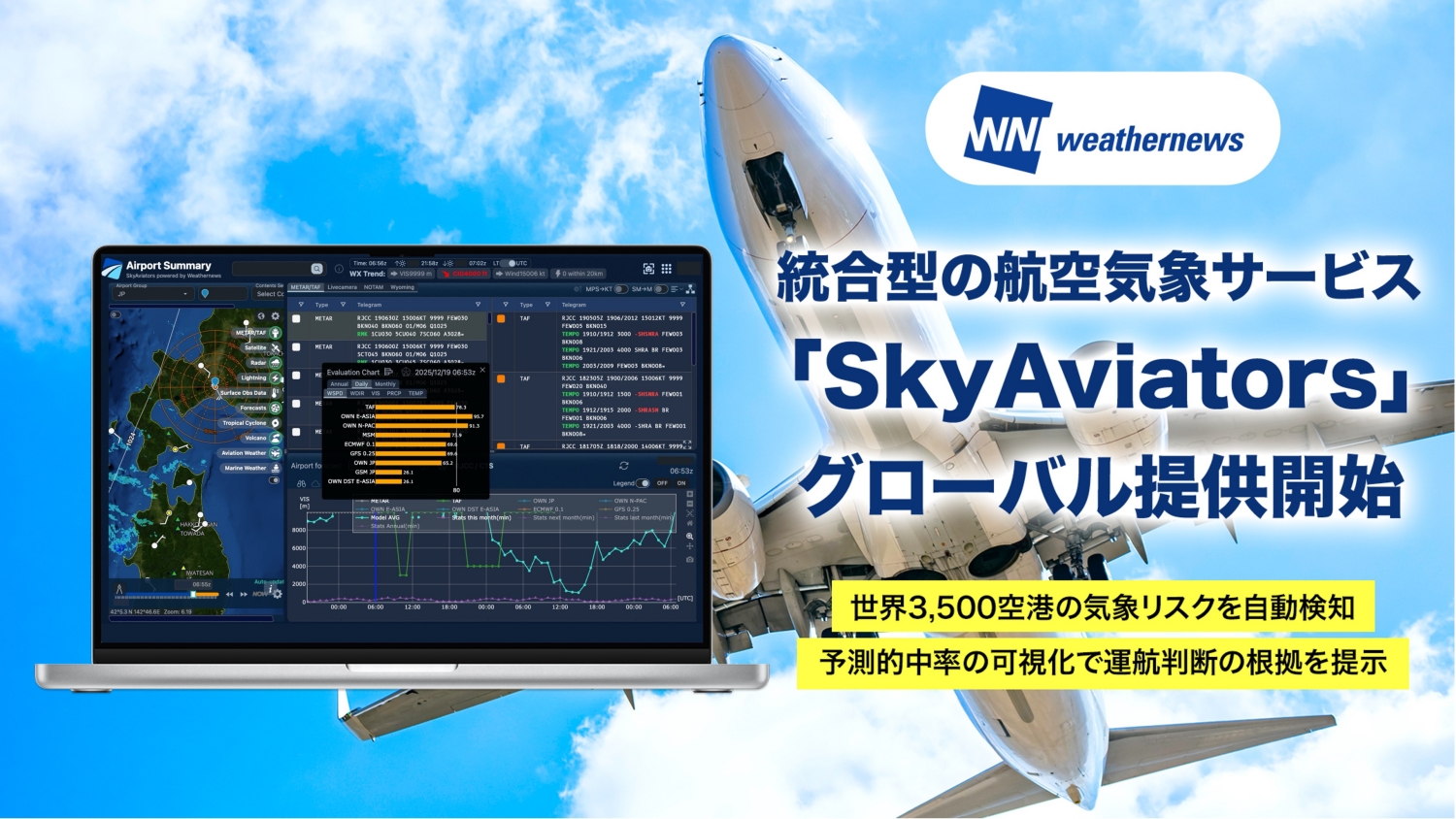 株式会社ウェザーニューズ(本社:千葉市美浜区、代表取締役社長:石橋 知博)は、航空業界の安全運航と航空会社の飛行計画策定の効率化を支援するため、統合型の航空気象サービス「SkyAviators」のグローバルにおける提供を開始しました。 「SkyAviators」は、運航に必要な気象データ、気象コンテンツを一元化し、運航の可否判断を客観的なデータから迷いなく行えることを目的とした統合型の航空気象サービスです。