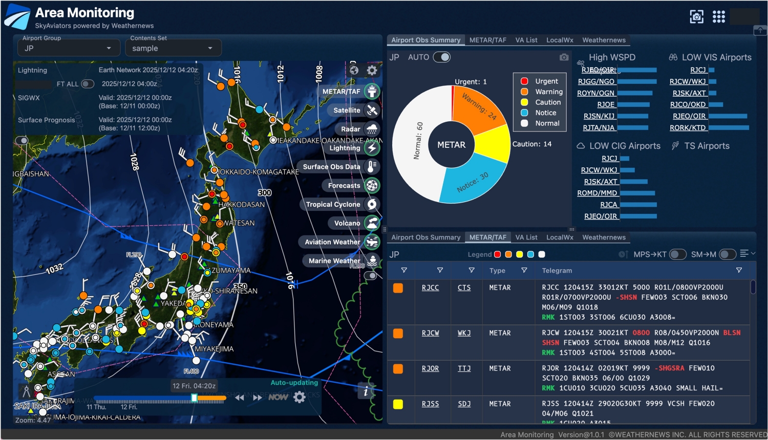 [Link]気象モデルの予測精度を可視化する「SkyAviators」世界3,500以上の空港の中から、天気や風速、視程、雲底高度などの閾値を超えるリスクのある空港をリアルタイムで自動抽出します。気象リスクのある空港はサマリーとして画面に提示されるため、膨大な監視対象の中から注視すべき空港を即座に特定することが可能です。これにより監視対象の見落としリスクを減らし、グローバル規模での運航監視の効率化に貢献します。