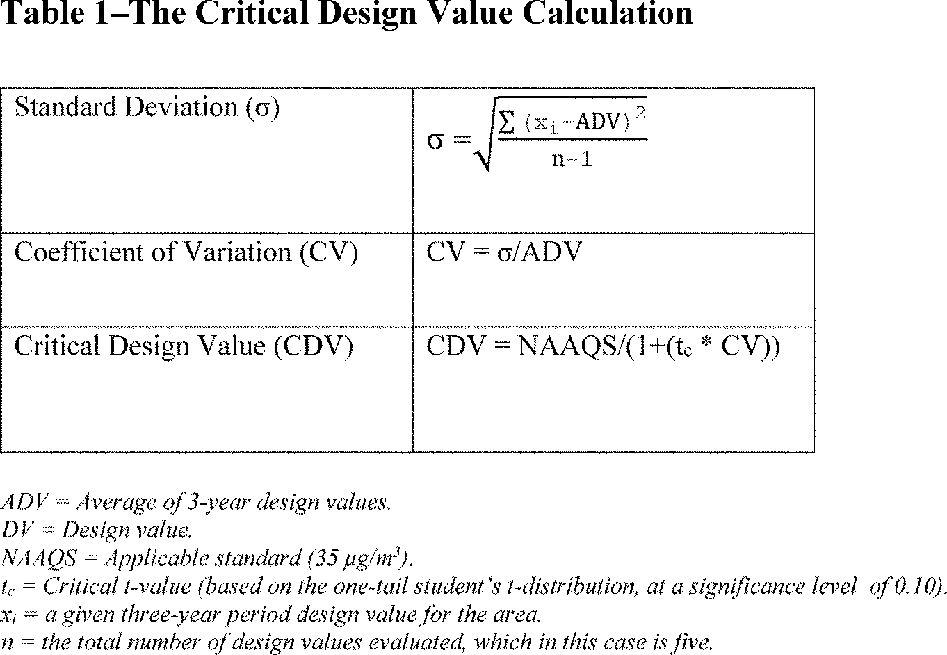 The PM 2.5 LMP Guidance, similar to the PM 10 LMP Guidance, allows states to demonstrate that certain areas qualify for an LMP by showing that, based on their most recent consecutive five years of measured air quality, they are unlikely to violate the NAAQS in the future. Specifically, the PM 2.5 LMP Guidance relies on the critical design value (CDV) concept. This guidance directs states to calculate a site-specific CDV for the monitoring site in an area with the highest design value, and to monitor for all other active monitoring sites in the area with complete data. The highest design value is used because it represents the highest level of PM 2.5 pollution an area has experienced over the past five years. The PM 2.5 LMP Guidance states that areas should show that the average design value (ADV) for each monitoring site in the area, i.e., the average of at least the most recent consecutive five years of PM 2.5 design values, does not exceed the associated CDV for each site. (6) If the ADV for each monitoring site in the area is below the CDV, then the probability of a future exceedance, based on the area's historical air quality and variability, is less than ten percent. The CDV calculation for a monitoring site involves the following parameters: (1) the level of the relevant NAAQS; (2) the co-efficient of variation (relative difference in PM 2.5 concentrations among grids within a ZIP code) of recent design values measured at that site; and (3) a statistical parameter corresponding to a ten-percent probability of exceedance, such that sites with historically high variability in design values result in a lower (or more stringent) CDV. The eligibility calculation equations for the CDV demonstration are shown in table 1.