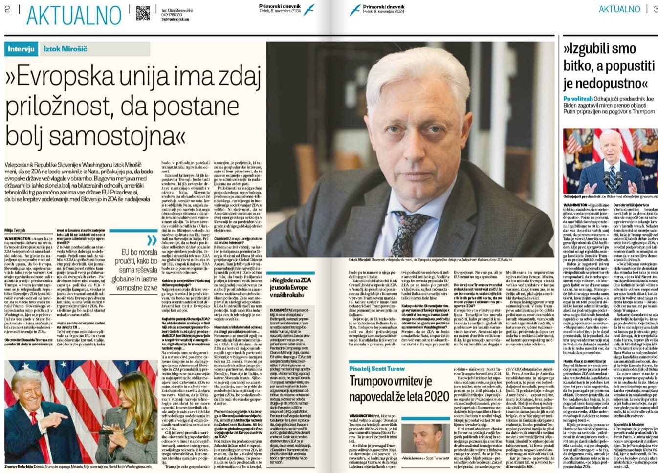 Intervju z Iztokom Mirošičem, veleposlanikom Republike Slovenije v ZDA ob izvolitvi Donalda Trumpa v časopisu Primorski dnevnik.
