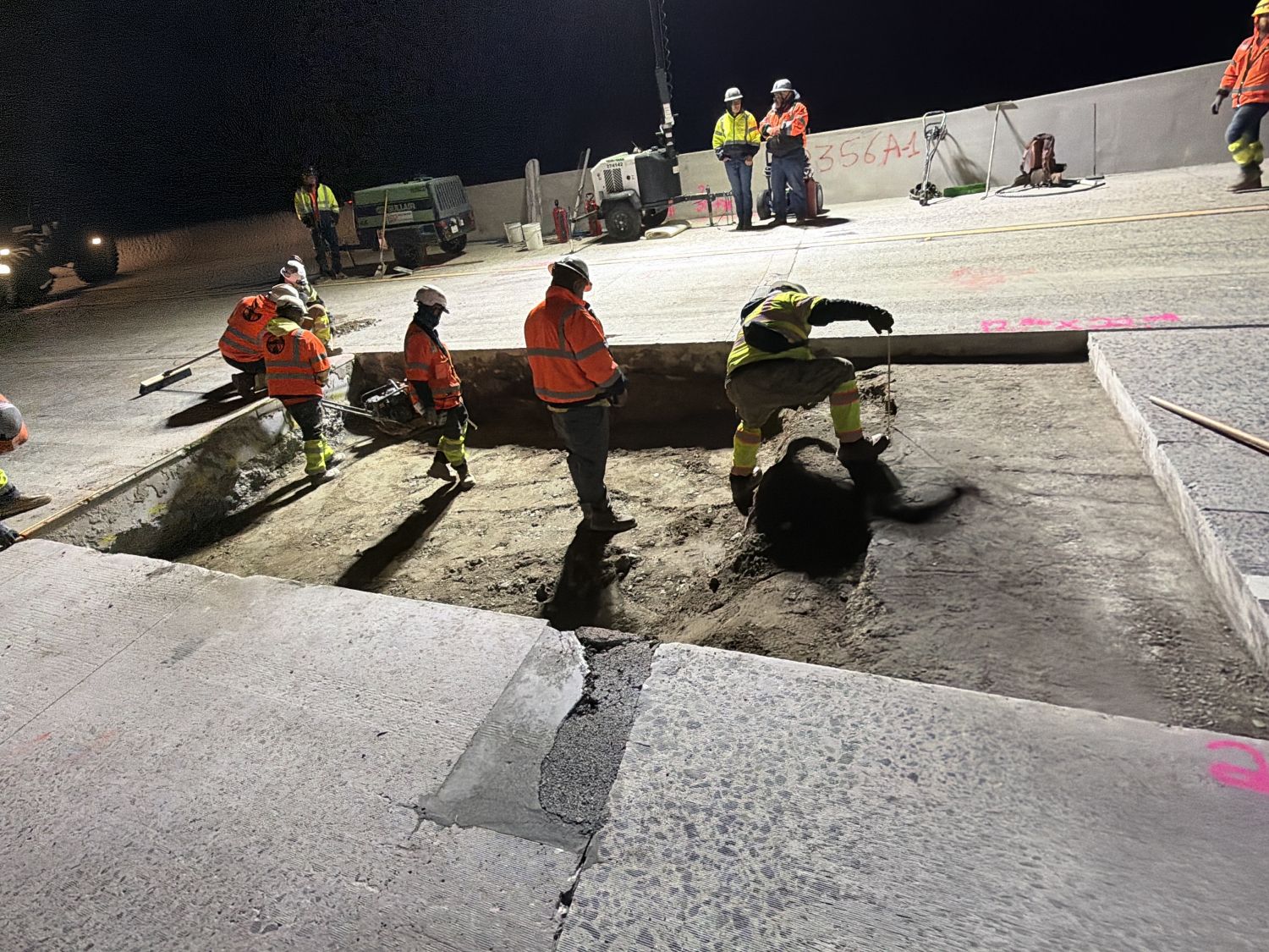Throughout November and December, a total of 61 slabs were replaced. These slabs displayed some cracking requiring replacement to prevent rapid deterioration and reduce roadway hazards. Construction crews cut out these existing slabs in segments, performing this work at night to ensure the safety of the crews and to reduce travel time disruptions. After the replacement slabs were in place, crews performed grinding and striping to ensure a smooth roadway.