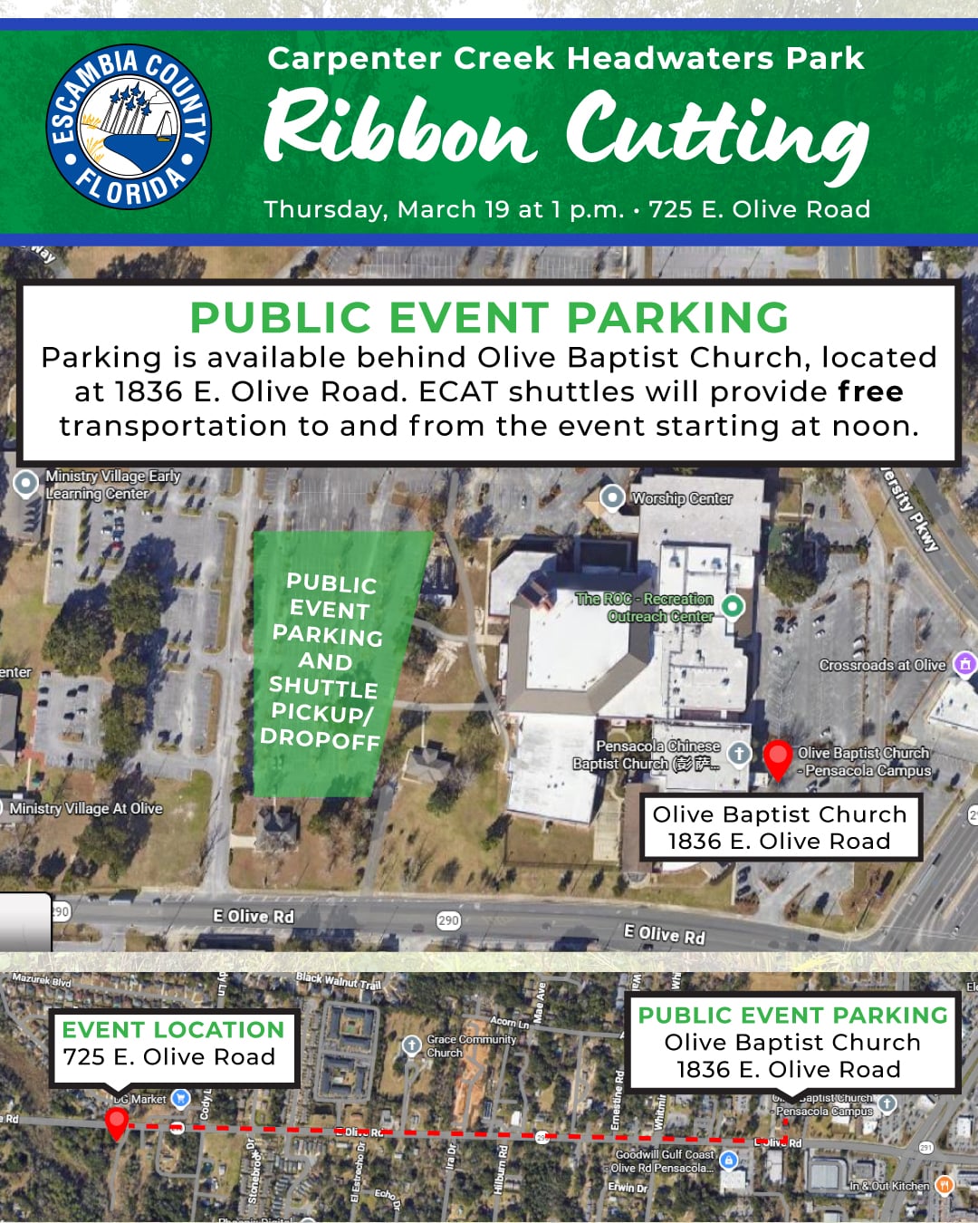 Please note: Parking at Carpenter Creek Headwaters Park is limited. Public event parking is available behind Olive Baptist Church, located at 1836 Olive Road, in the parking lot marked on the event parking map. Escambia County Area Transit will provide free shuttles to and from the event beginning at noon. Please see the map below for additional details.
