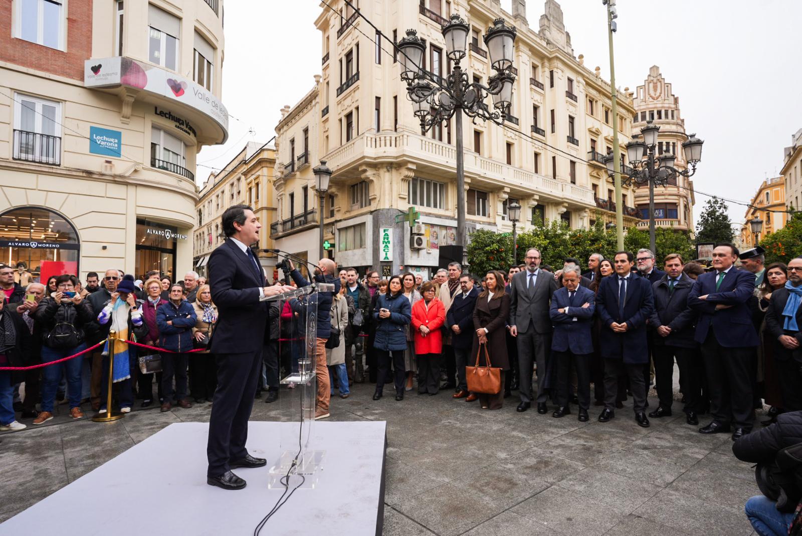 Este viernes, en la Plaza de las Tendillas de Córdoba, se ha inaugurado el nuevo monumento en homenaje al 4 de diciembre, Día de la Bandera de Andalucía. El acto ha sido presidido por Juanma Moreno, presidente de la Junta de Andalucía, y José María Bellido, alcalde de Córdoba y presidente de la FAMP, acompañados de la Secretaria General de la FAMP, Yolanda Sáez. También han asistido numerosos representantes políticos de localidades sevillanas de Coria del Río y Alcalá de Guadaíra, así como miembros de organizaciones sindicales, de las Fuerzas y Cuerpos de Seguridad del Estado, Fuerzas Armadas, representantes de la Fundación Blas Infante y la Cátedra 4D de la Universidad de Córdoba y vecinos de Córdoba.