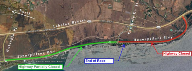 The southbound lane on Honoapi'ilani Highway between Hōkiokio Place and Kai Hele Kū Street near Launiupoko Beach Park will be closed during the race to reduce traffic and allow for runners for the 5K run.