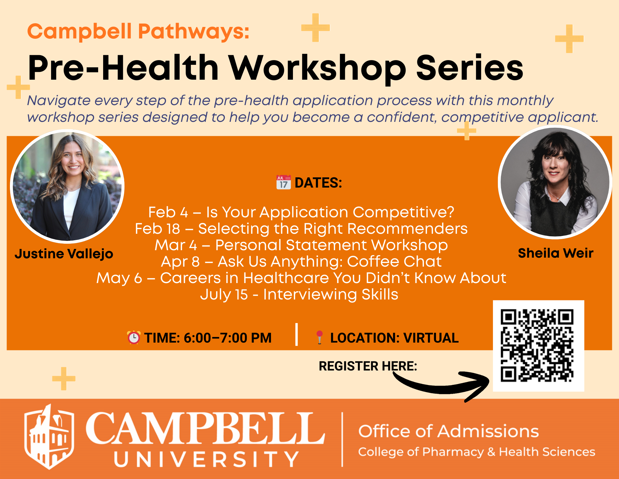Prospective students are encouraged to connect with a CPHS admissions team member to register for the full Campbell Pathways series or to select individual seminars that best align with their goals and stage in the application process. Students can use this Zoom link https://campbell-edu.zoom.us/j/9236990625 to participate in any of the sessions to take the next step toward a successful future in the health sciences.