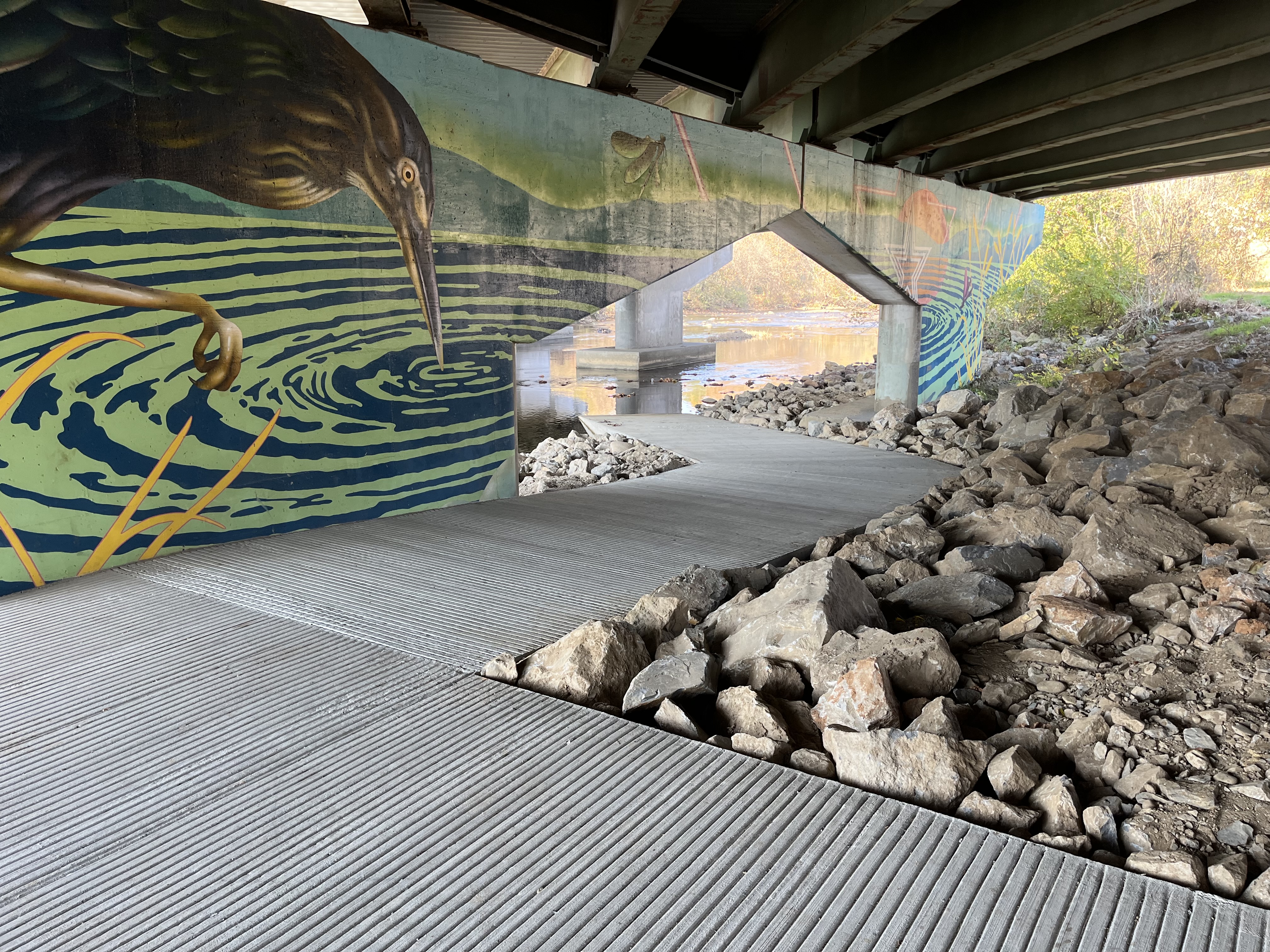 (Editors: Follow this link to download an image. Photo caption: A project to improve accessibility for a Roanoke River Blueway access point was supported by the Open Space Recreation and Conservation Fund.][alt:Colorful large mural of a bird dipping its beak into water painted on a concrete wall alongside and arching over an accessible pathway under a bridge leading to a riverbank.)