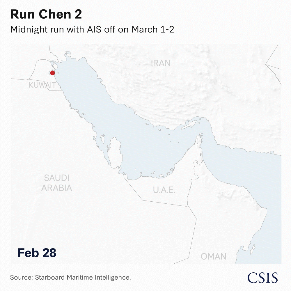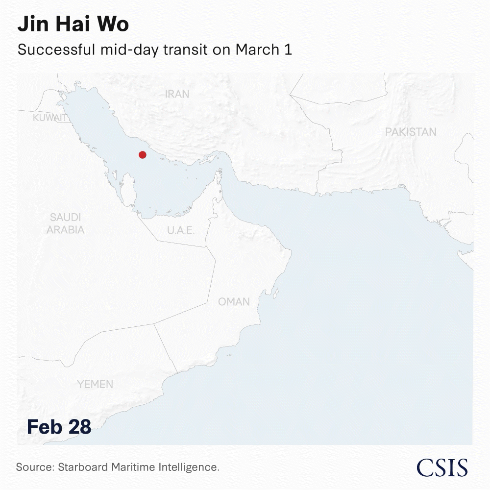 Bulk cargo carrier Jin Hai Wo managed to pass through midday on March 1, while another container ship, Run Chen 2, appears to have made a midnight run through the strait with its AIS transponder turned off. Its signal went dark at 9:30 pm local time on March 1 near the western mouth of the strait before reappearing in the Gulf of Oman at 4:20 am the next morning.