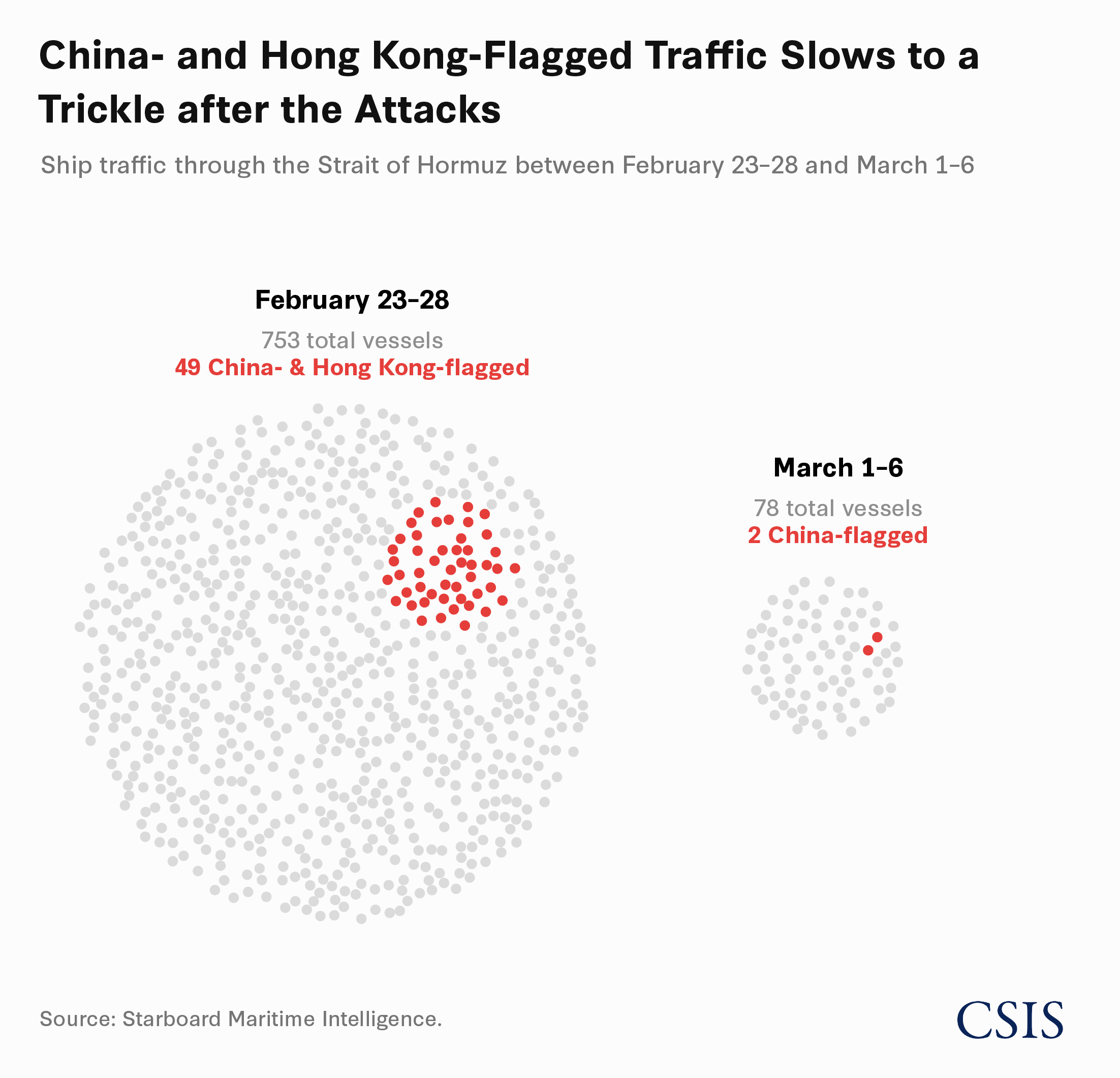 Between February 23 and 28, AIS data shows that more than 49 Chinese- and Hong Kong-flagged vessels transited the Strait of Hormuz. But since March 1, just two Chinese-flagged ships have been observed transiting the strait.