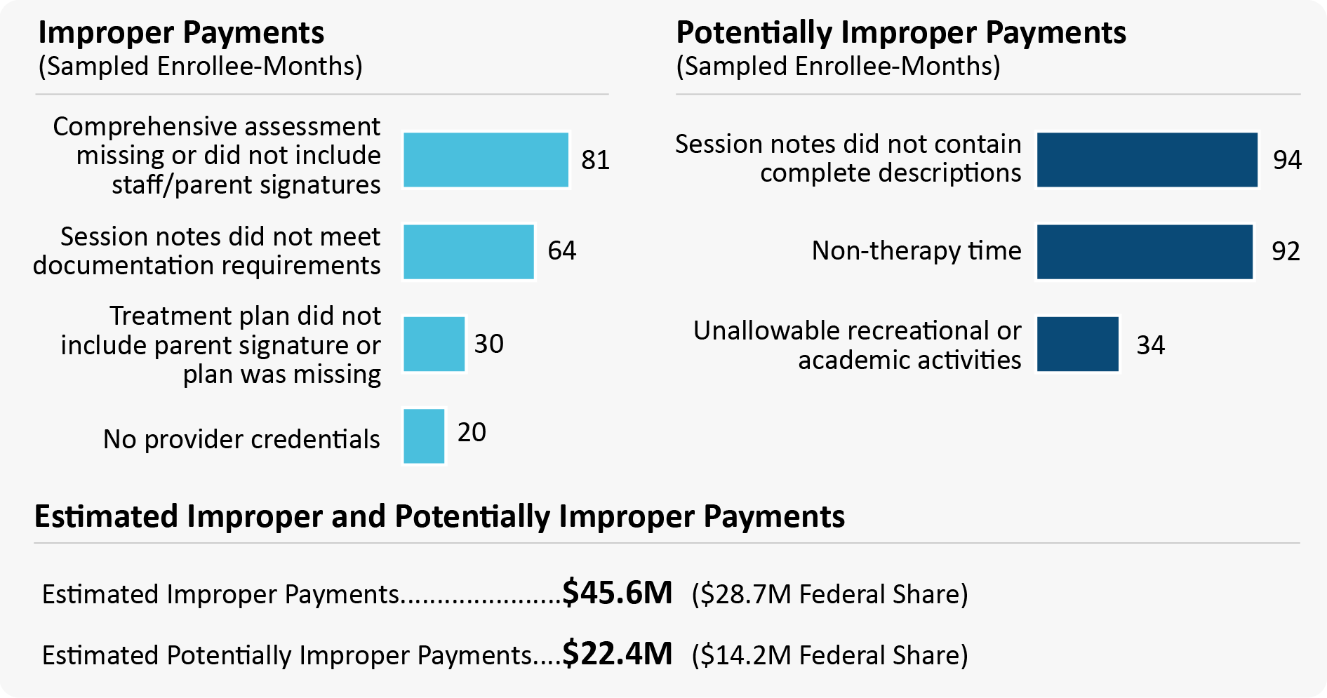Maine's payments for RCS services did not fully comply with Federal and State requirements. All 100 sampled enrollee-months included payments for one or more claim lines that were improper or potentially improper. On the basis of our sample results, we estimated the State agency made improper payments of at least $45.6 million ($28.7 million Federal share).