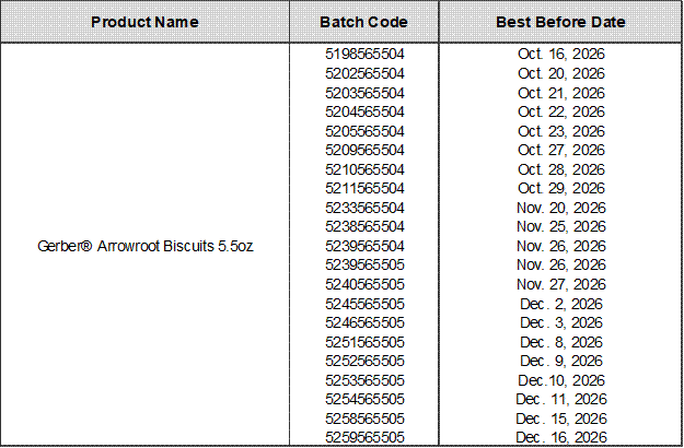 HONOLULU - The Hawai'i Department of Health (DOH) Food and Drug Branch (FDB) is alerting residents to a recall issued by Gerber Products Company for limited batches of its Gerber® Arrowroot Biscuits. The recall was issued due to the potential presence of soft plastic and/or paper pieces which may cause injury or pose a choking hazard. The material originated from an arrowroot flour supplier that initiated the recall.