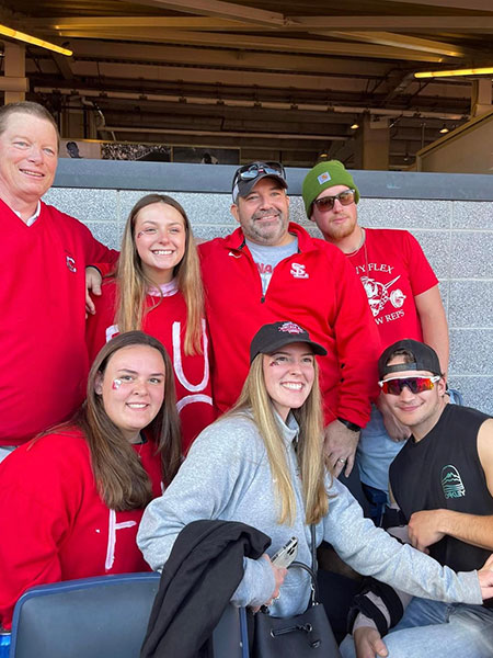 Dann joined several Saranac Lake, N.Y., Red Dragons and their friends to cheer during the 2022 Cortaca Jug at Yankee Stadium. Present, front row from left, were Katelyn Gay '24, Madelyn Gay '24 and Braden Ryan; and back row, Mark Farmer '83, Nora Glover '24, Josh and Jackson Hunt-Lamb.