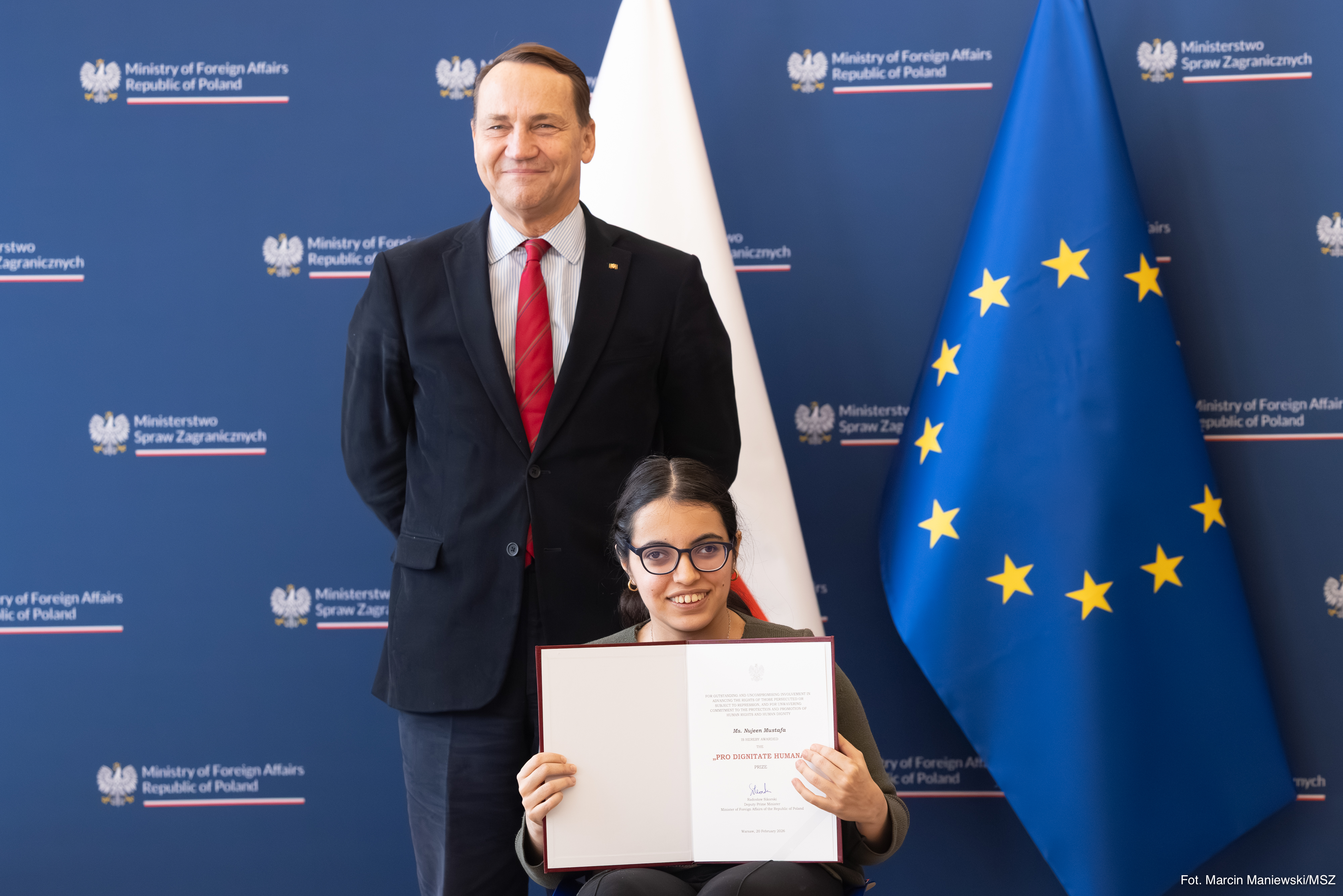 Nujeen Mustafa - Syryjka zaangażowana na rzecz osób z niepełnosprawnościami otrzymała dziś z rąk szefa polskiej dyplomacji nagrodę Pro Dignitate Humana. Wyróżnienie stanowi wyraz uznania dla jej wieloletniego zaangażowania w obronę godności i praw osób, szczególnie narażonych na wykluczenie w sytuacjach konfliktów zbrojnych i kryzysów humanitarnych.