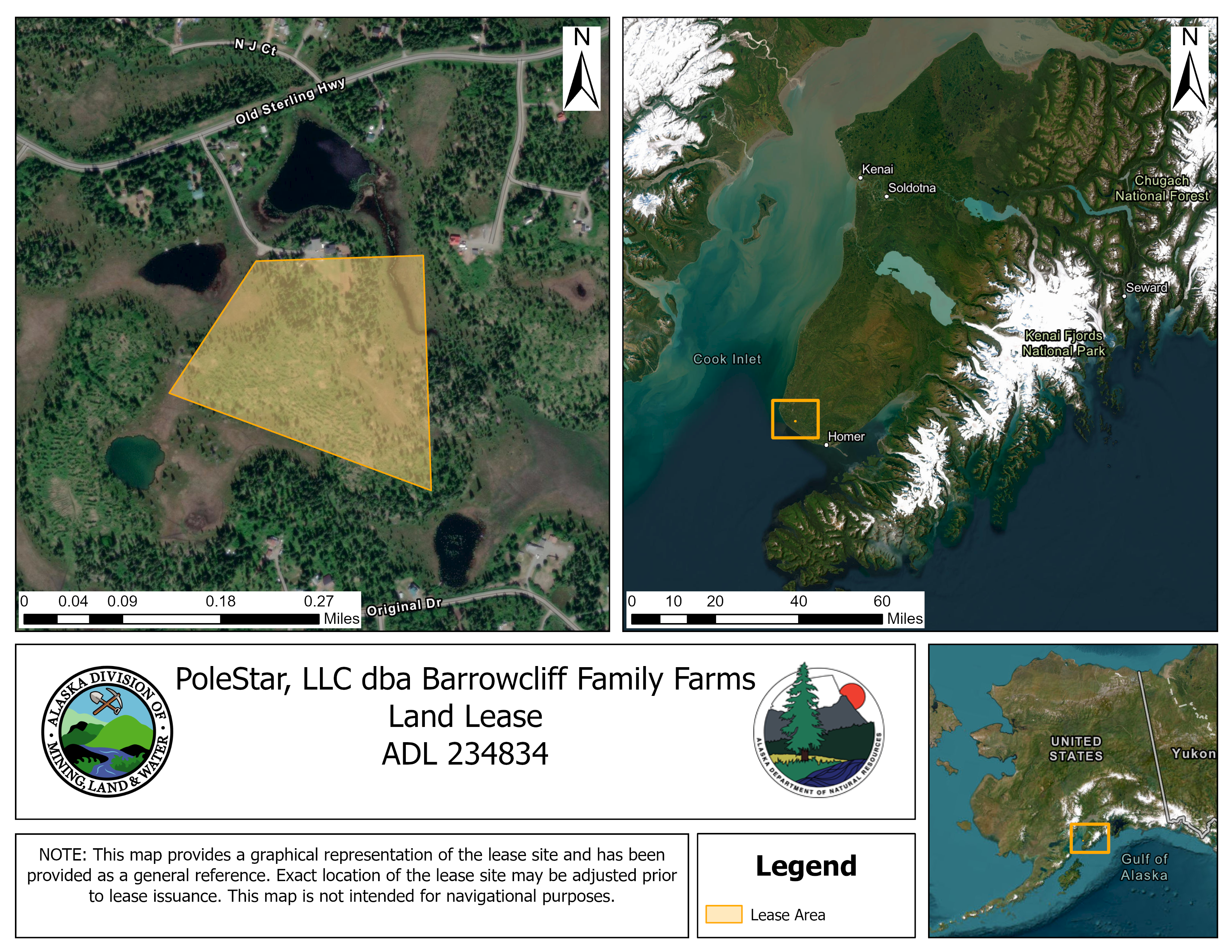 The Department of Natural Resources (DNR), Division of Mining, Land and Water (DMLW), Southcentral Regional Land Office (SCRO) has received an application to lease state-owned lands for agricultural purposes including the propagation and cultivation of produce, to be located approximately 4.5 miles southeast of Anchor Point. The proposed lease is located directly adjacent to the applicant's private property, within the S1/2 of Section 24, Township 5 South, Range 15 West, Seward Meridian, Alaska. The area identified for a potential lease tract is approximately 22.25 acres. The request is for a 15-year lease under AS 38.05.070(c). The project would seek to expand the existing small-scale, organic family farm.