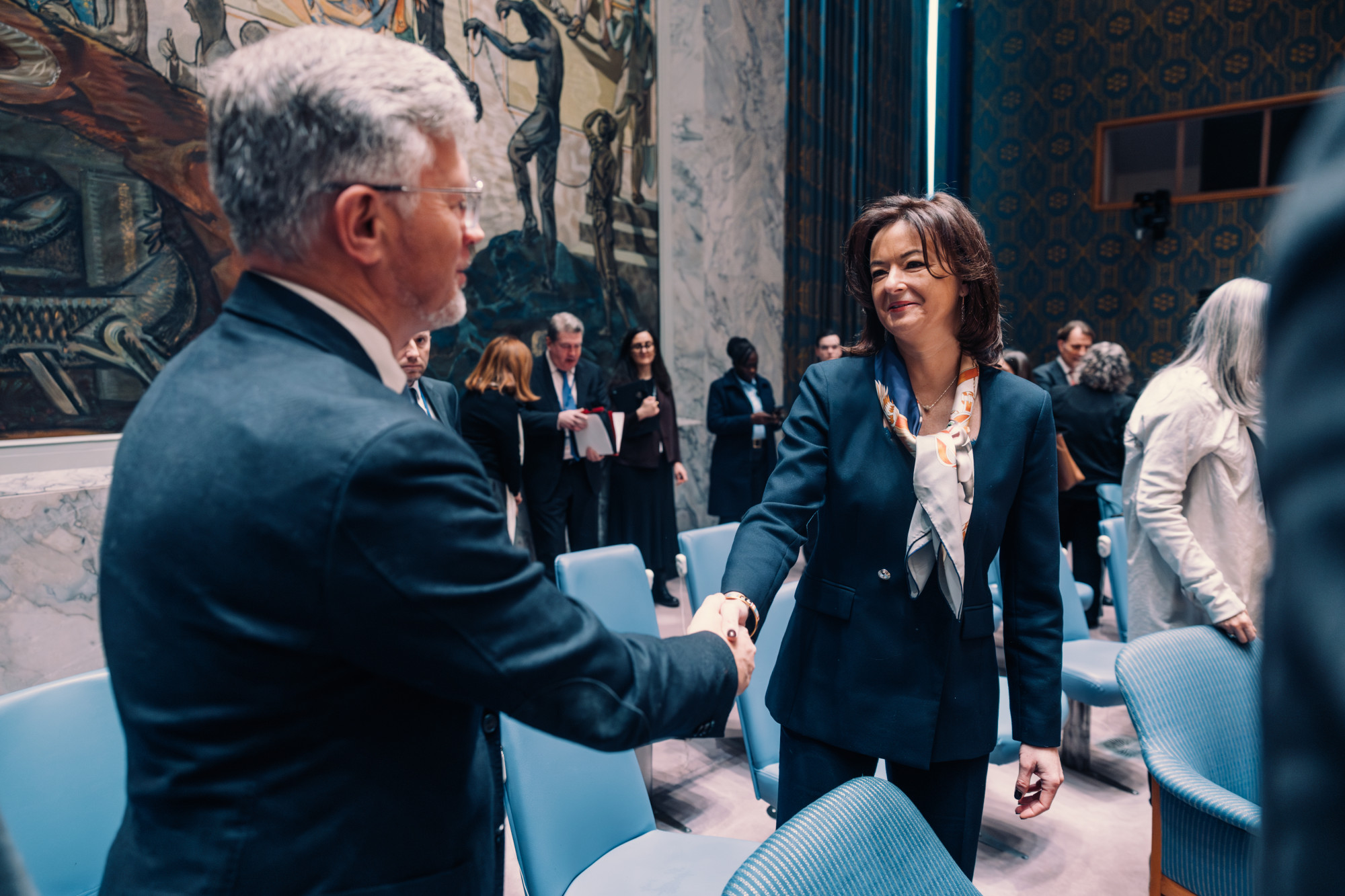 »Kmalu bodo minila štiri leta, odkar je Rusija začela svojo invazijo na Ukrajino. Skoraj štiri leta, odkar je sprožila odkrito agresorsko vojno proti suvereni in manjši sosedi. Štiri leta odkritega in ponavljajočega se kršenja mednarodnega prava. Štiri leta opustošenja, uničenih življenj in sanj ter izgubljenih sredstev za preživetje. Štiri leta uničevanja šol, bolnišnic in domov. Kdaj bo tega konec? Kaj kot najpomembnejša organizacija za mir in varnost v svetu sporočamo ljudem, če 'mirno' opazujemo, kako se 'veliki' spravljajo na 'manjše' brez posledic?« je v uvodu poudarila ministrica.