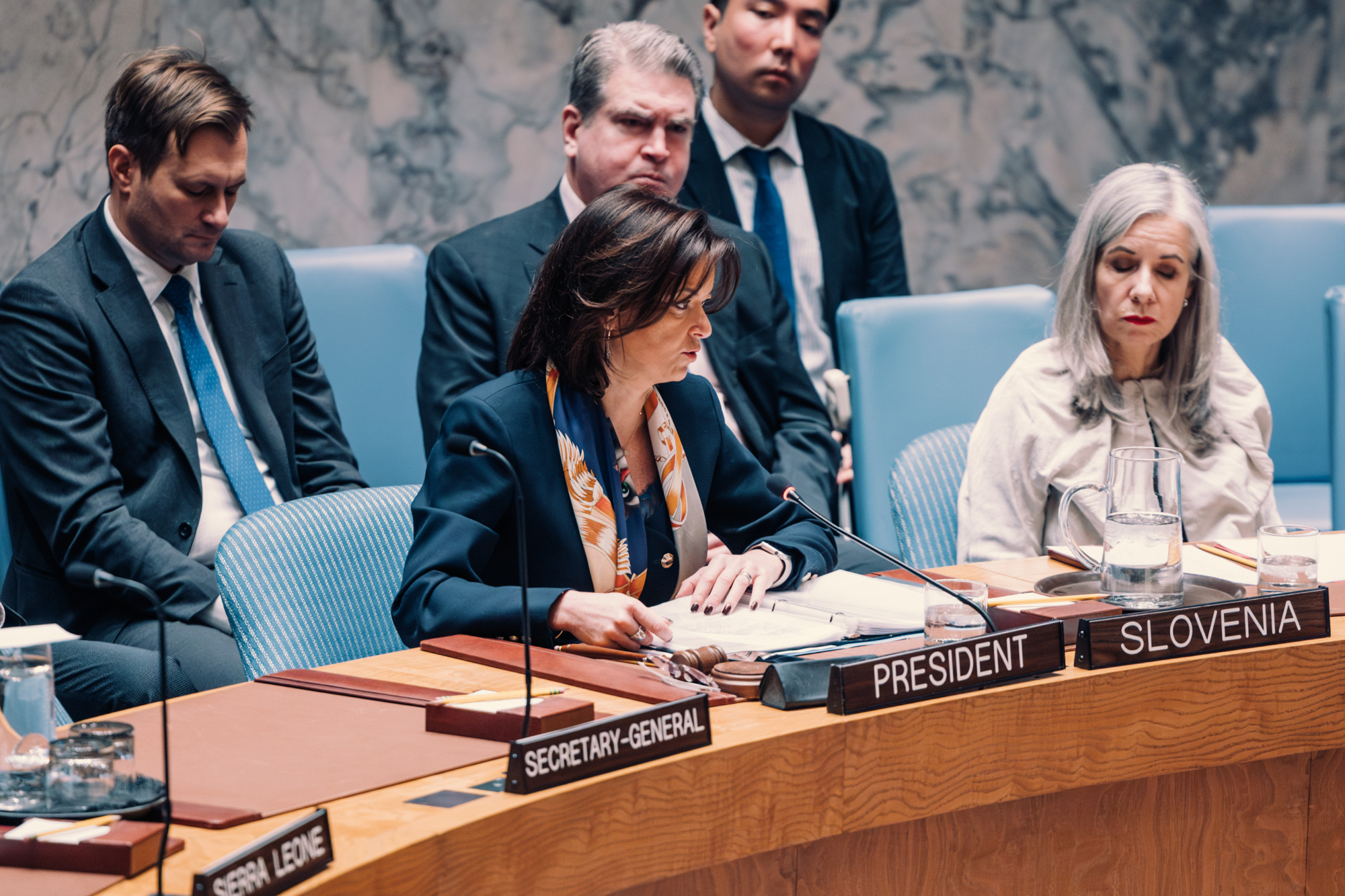 Spomnila je, da je Slovenija pred dvema letoma prevzela dosje Ukrajine s posebno odgovornostjo: »Slovenija nikoli ni bila pasivna ali nema opazovalka dogajanja. Slovenija je večkrat poskušala pristopiti z lastnimi pobudami za dosego miru, vendar Ruska federacija vse od začetka vojne z vetom onemogoča delovanje Varnostnega sveta na tem področju.