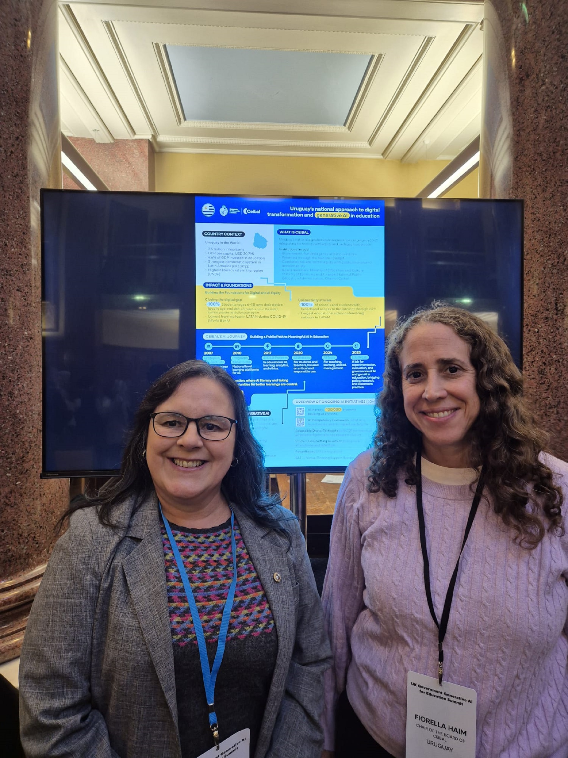 Durante la instancia, la subsecretaria Verde, junto con la presidenta de Ceibal, Fiorella Haim, realizaron una presentación sobre el enfoque que Uruguay está implementando referido a la transformación digital y el uso de la Inteligencia Artificial Generativa en la Educación.