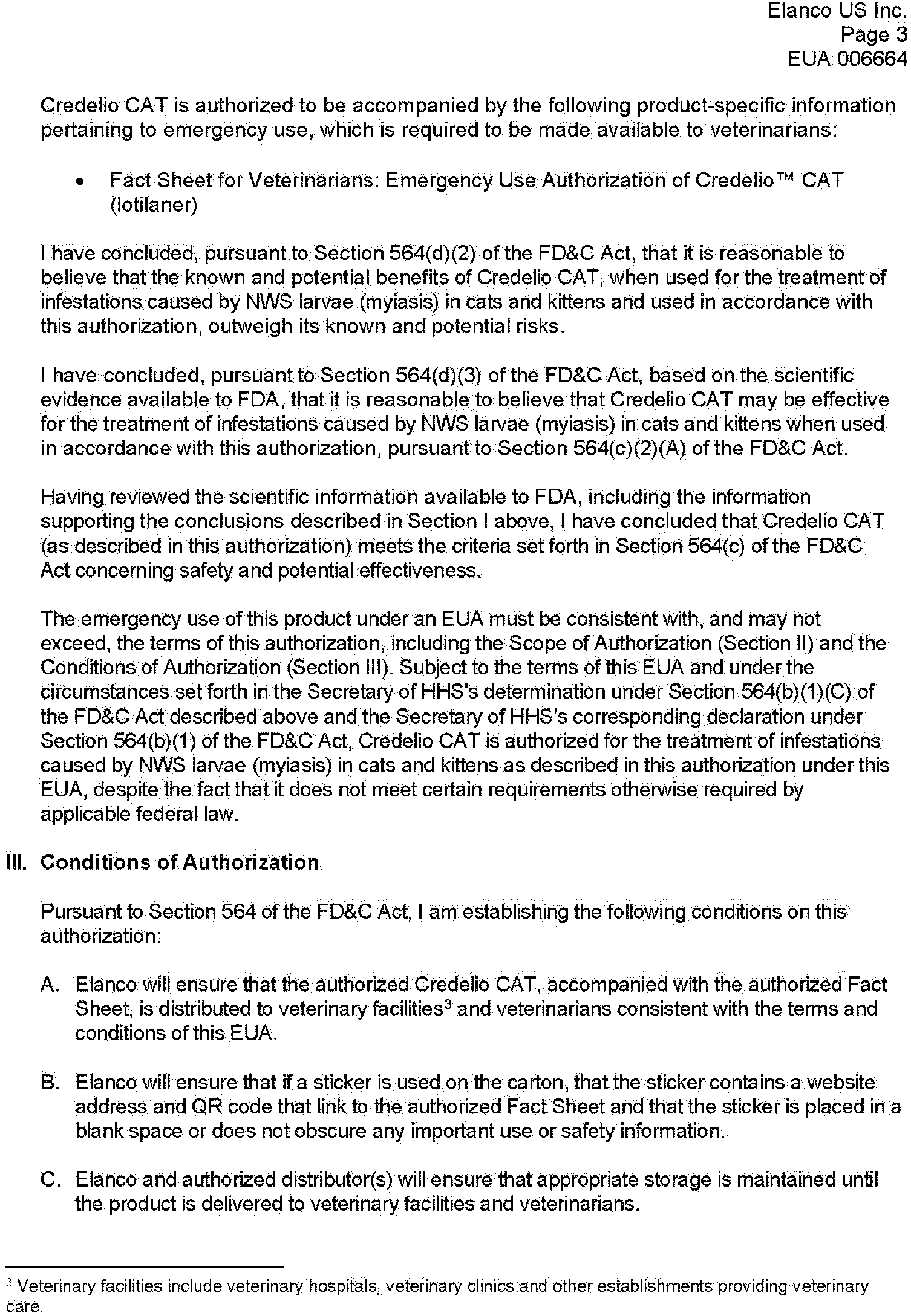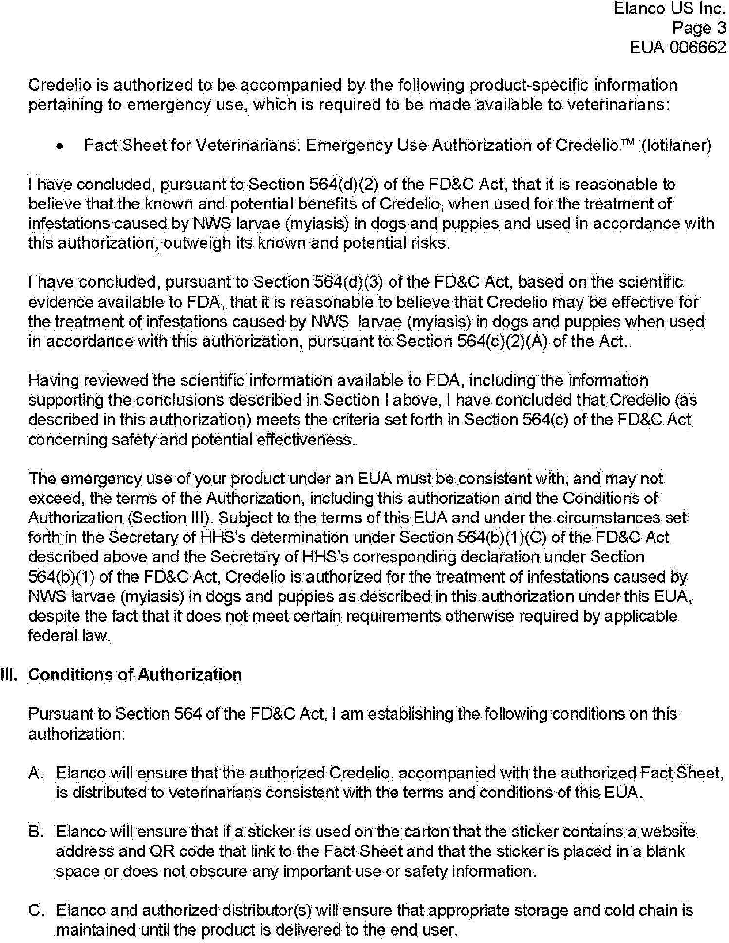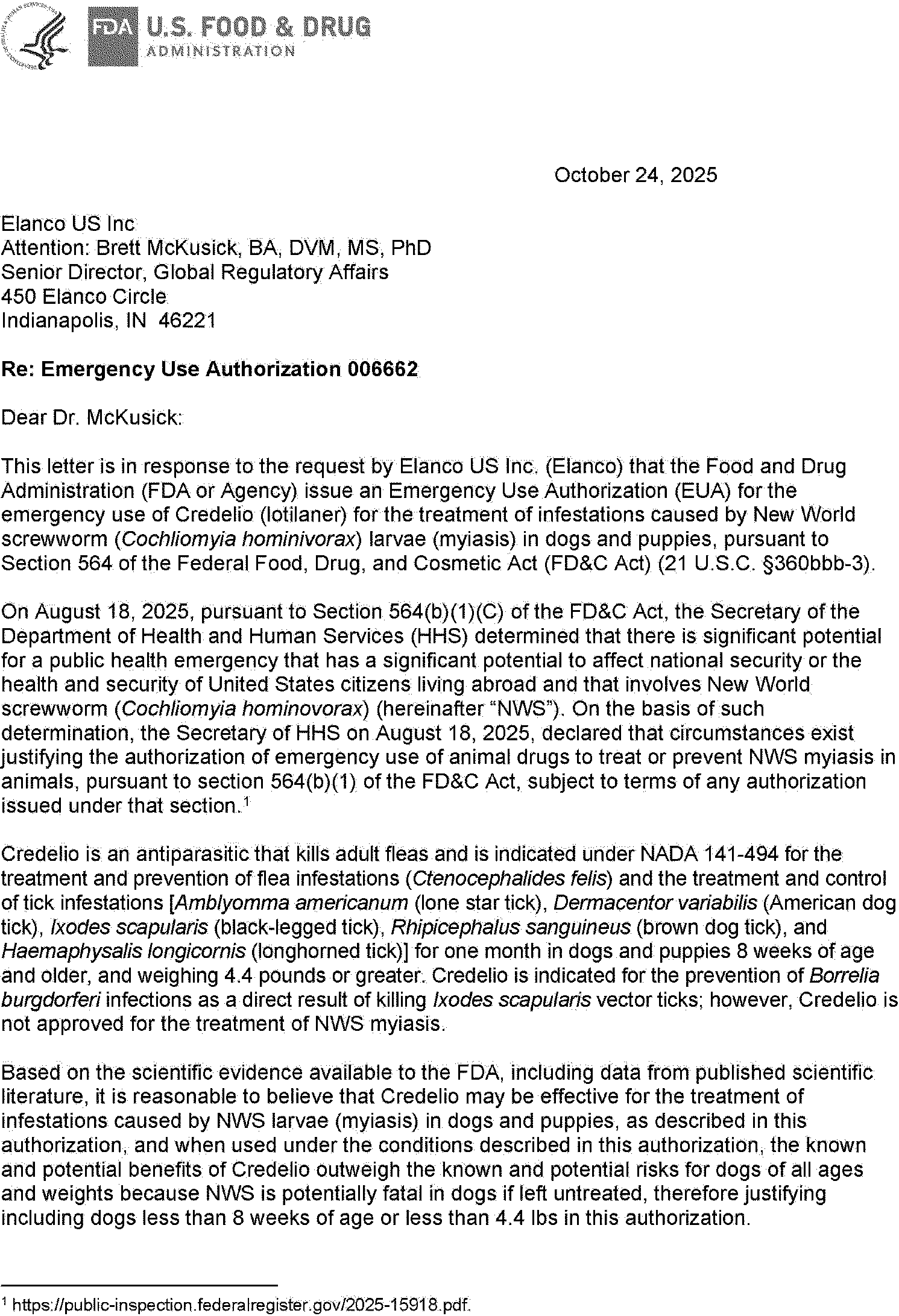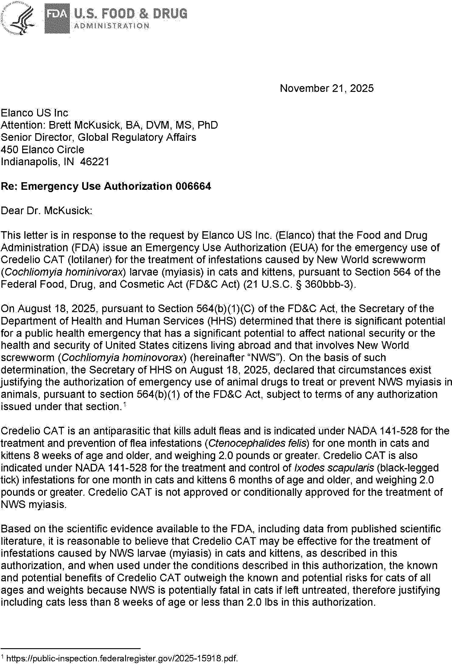 The Authorizations follow the August 18, 2025, determination by the Secretary of HHS that there is a public health emergency, or a significant potential for a public health emergency, that affects, or has a significant potential to affect, national security or the health and security of U.S. citizens living abroad and that involves NWS. On the basis of such determination, the Secretary of HHS declared, on August 18, 2025, that circumstances exist justifying the authorization of emergency use of animal drugs to treat or prevent NWS myiasis in animals. Notice of the Secretary's determination and declaration was provided in the Federal Register on August 20, 2025 (90 FR 40609). Having concluded that the criteria for the issuance of the Authorizations under section 564(c) of the FD&C Act are met, FDA has issued two authorizations for the emergency use of animal drug products. On October 24, 2025, FDA issued an EUA to Elanco US Inc. for the animal drug product Credelio (lotilaner), subject to the terms of its Authorization. On November 21, 2025, FDA issued an EUA to Elanco US Inc. for the animal drug product Credelio CAT (lotaliner), subject to the terms of its Authorization.