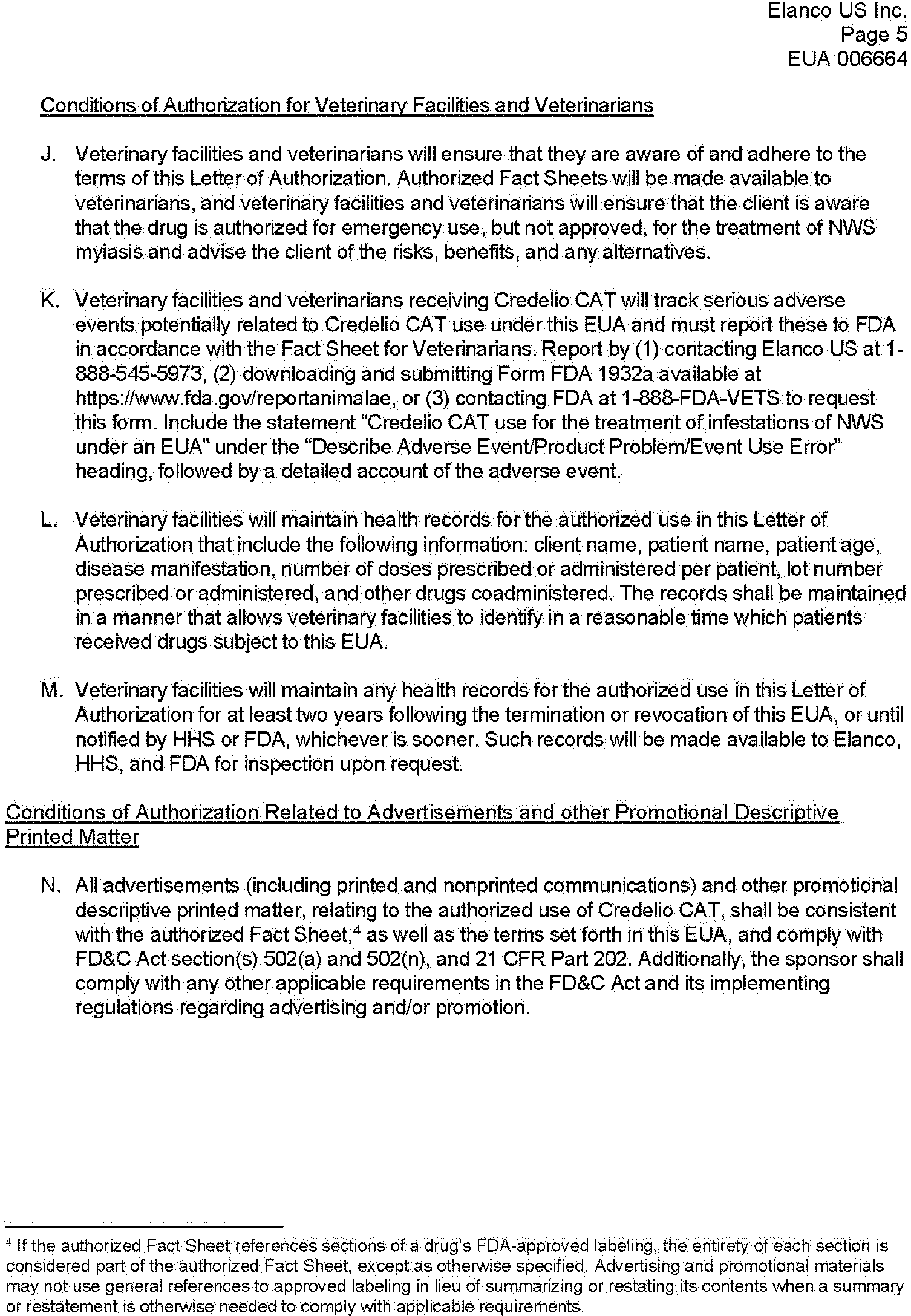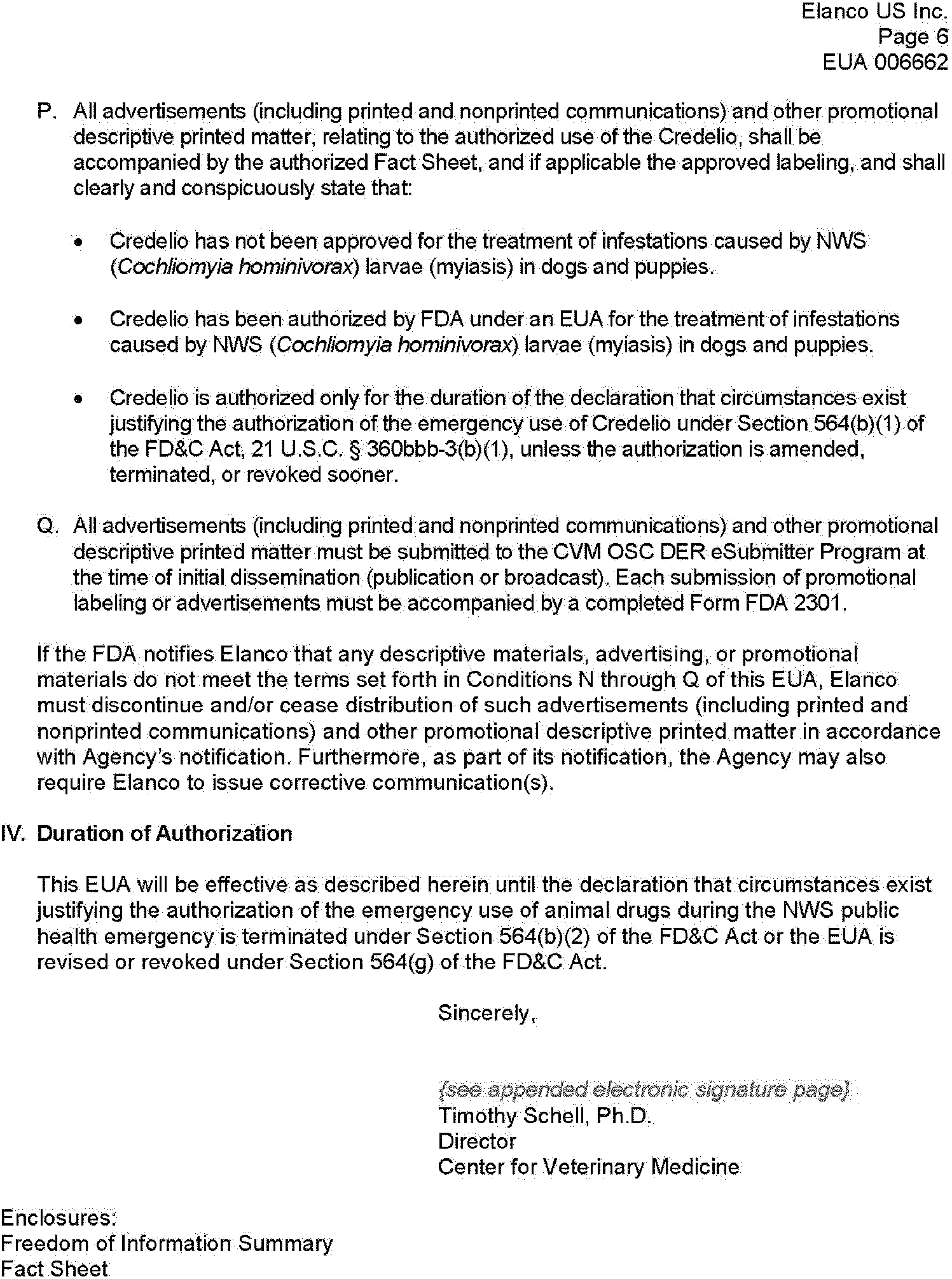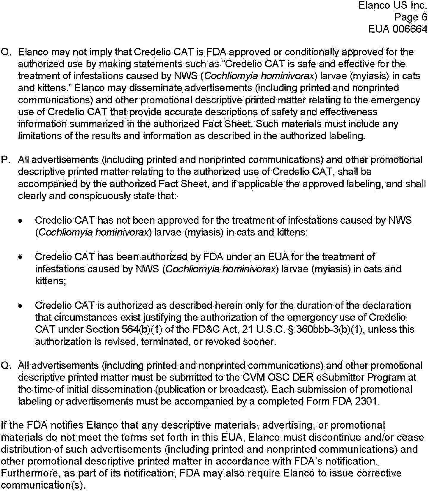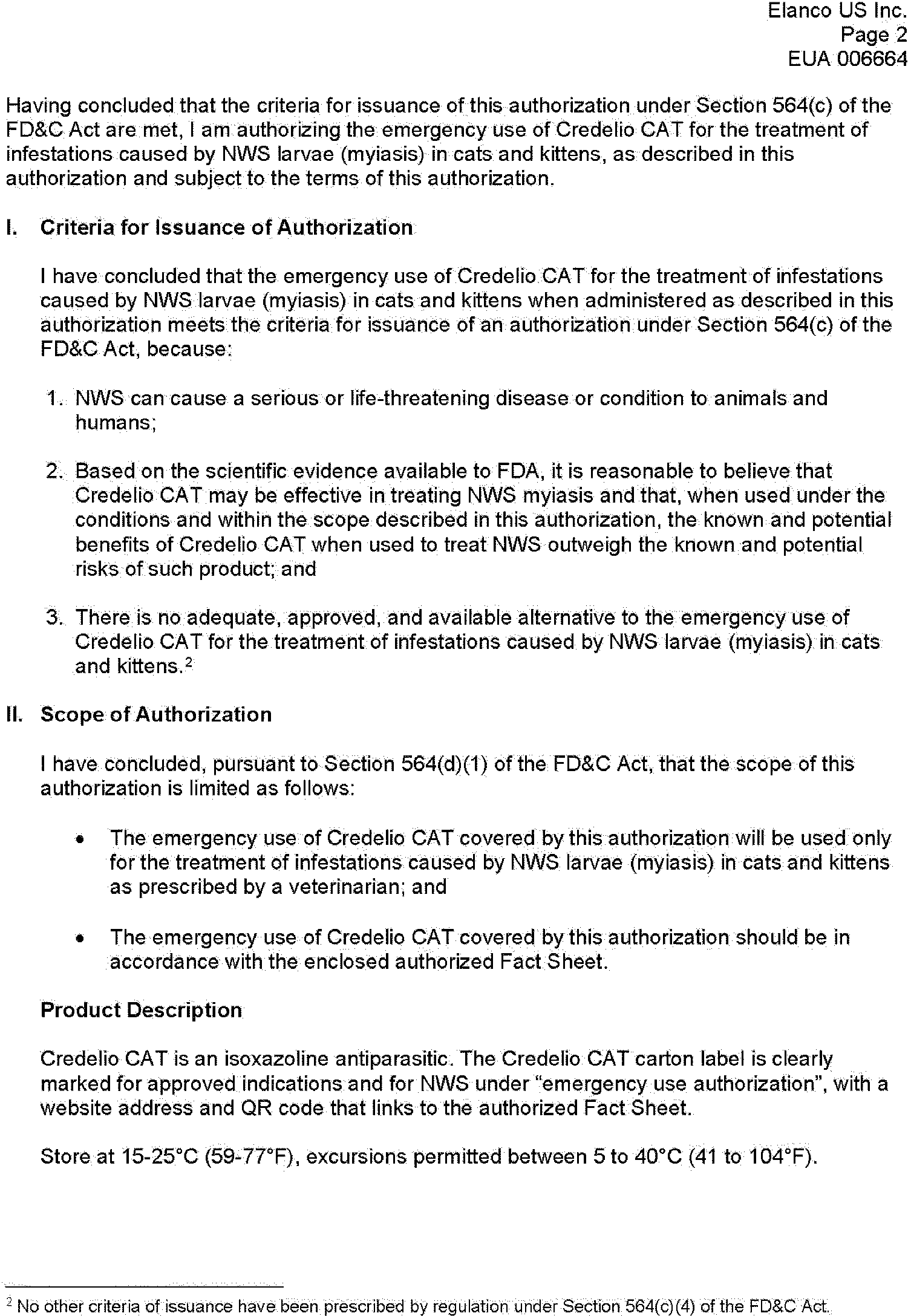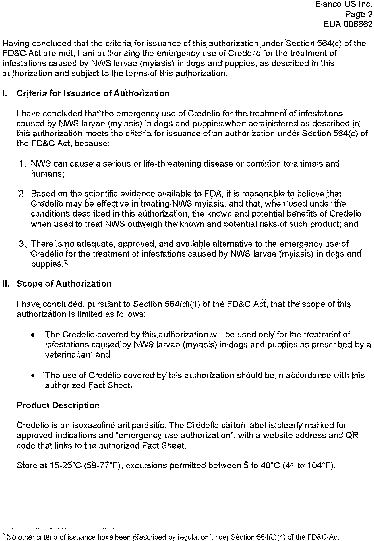 The Authorizations follow the August 18, 2025, determination by the Secretary of HHS that there is a public health emergency, or a significant potential for a public health emergency, that affects, or has a significant potential to affect, national security or the health and security of U.S. citizens living abroad and that involves NWS. On the basis of such determination, the Secretary of HHS declared, on August 18, 2025, that circumstances exist justifying the authorization of emergency use of animal drugs to treat or prevent NWS myiasis in animals. Notice of the Secretary's determination and declaration was provided in the Federal Register on August 20, 2025 (90 FR 40609). Having concluded that the criteria for the issuance of the Authorizations under section 564(c) of the FD&C Act are met, FDA has issued two authorizations for the emergency use of animal drug products. On October 24, 2025, FDA issued an EUA to Elanco US Inc. for the animal drug product Credelio (lotilaner), subject to the terms of its Authorization. On November 21, 2025, FDA issued an EUA to Elanco US Inc. for the animal drug product Credelio CAT (lotaliner), subject to the terms of its Authorization.