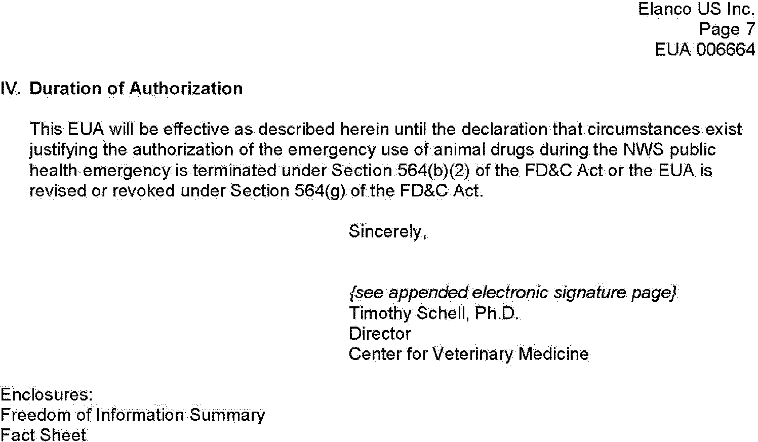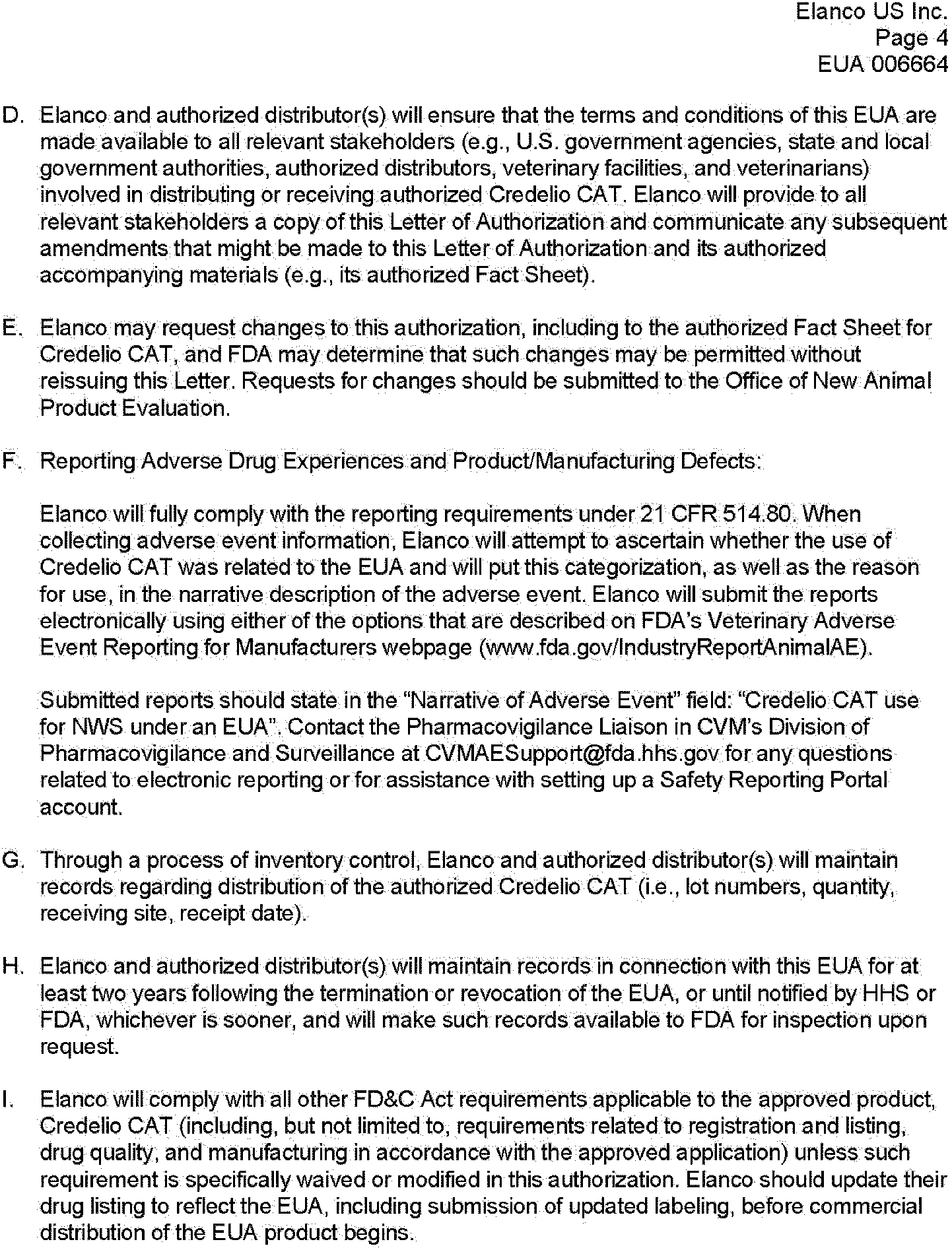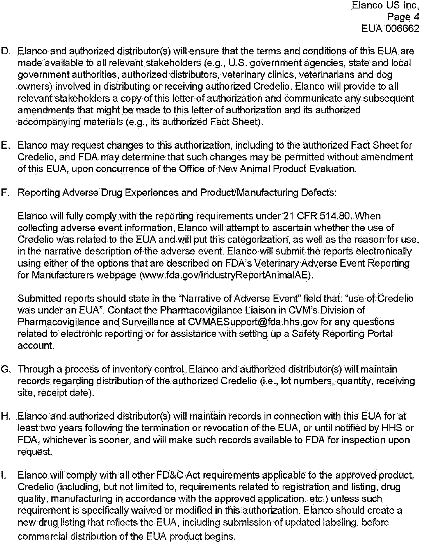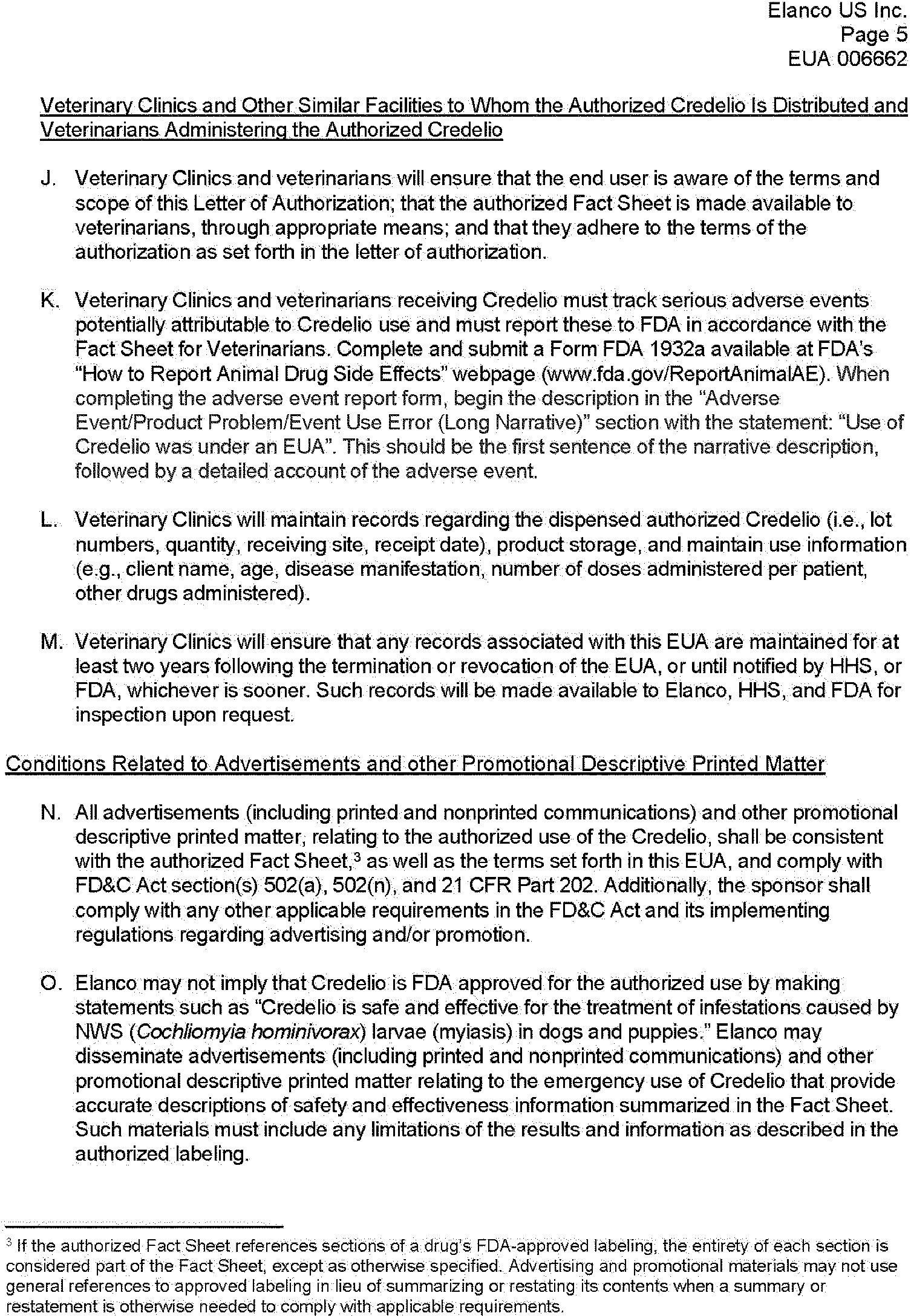 The Authorizations follow the August 18, 2025, determination by the Secretary of HHS that there is a public health emergency, or a significant potential for a public health emergency, that affects, or has a significant potential to affect, national security or the health and security of U.S. citizens living abroad and that involves NWS. On the basis of such determination, the Secretary of HHS declared, on August 18, 2025, that circumstances exist justifying the authorization of emergency use of animal drugs to treat or prevent NWS myiasis in animals. Notice of the Secretary's determination and declaration was provided in the Federal Register on August 20, 2025 (90 FR 40609). Having concluded that the criteria for the issuance of the Authorizations under section 564(c) of the FD&C Act are met, FDA has issued two authorizations for the emergency use of animal drug products. On October 24, 2025, FDA issued an EUA to Elanco US Inc. for the animal drug product Credelio (lotilaner), subject to the terms of its Authorization. On November 21, 2025, FDA issued an EUA to Elanco US Inc. for the animal drug product Credelio CAT (lotaliner), subject to the terms of its Authorization.