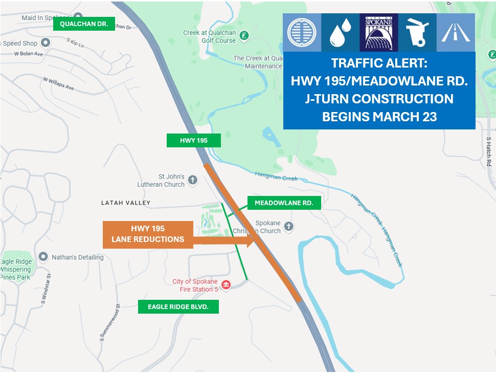 City of Spokane will begin a traffic safety improvement project on the US 195 corridor Monday, March 23. The project will install a "J-turn" at the intersection of Meadowlane Rd. and US 195. Acceleration and deceleration lanes will improve safety, reduce congestion, and helps prepare the area for future growth. A new sidewalk along south Meadowlane Rd. between Eagle Ridge Blvd. and Turner Ave. will also be added to enhance pedestrian safety. The project is expected to be completed by mid-to-late July.