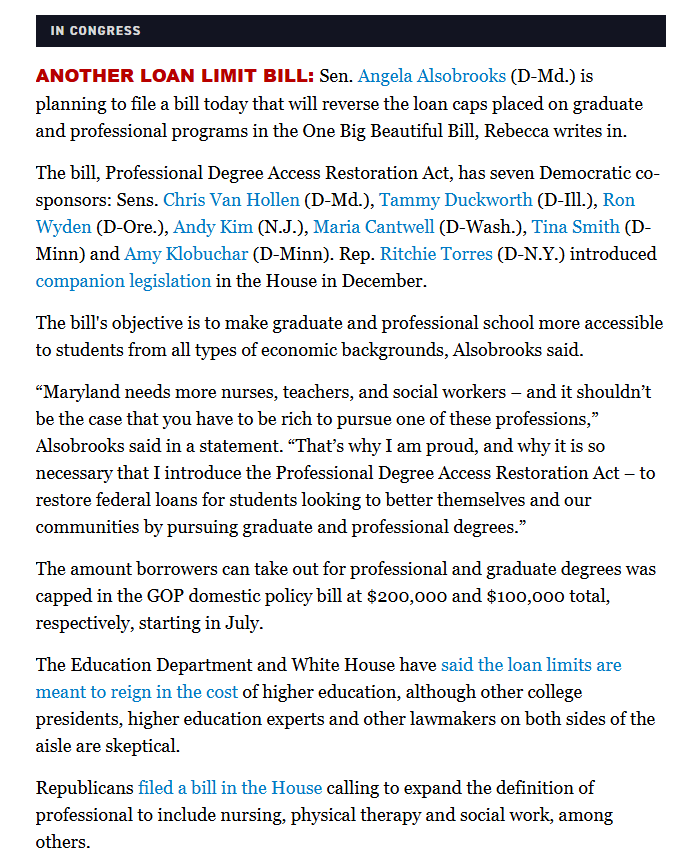 WASHINGTON, DC - As reported in Politico's Morning Education, Senator Angela Alsobrooks (D-Md.) introduced the Professional Degree Access Restoration Act, which reverses recent reductions in federal loan availability for graduate and professional students. The bill would amend the Higher Education Act of 1965 to restore the full loan limits that were narrowed under President Trump's One Big Beautiful Bill Act, ensuring students pursuing advanced degrees can access the financial support they need. This bill expands access to advanced education for those seeking to pursue careers in nursing, teaching, social work, medicine, and more.