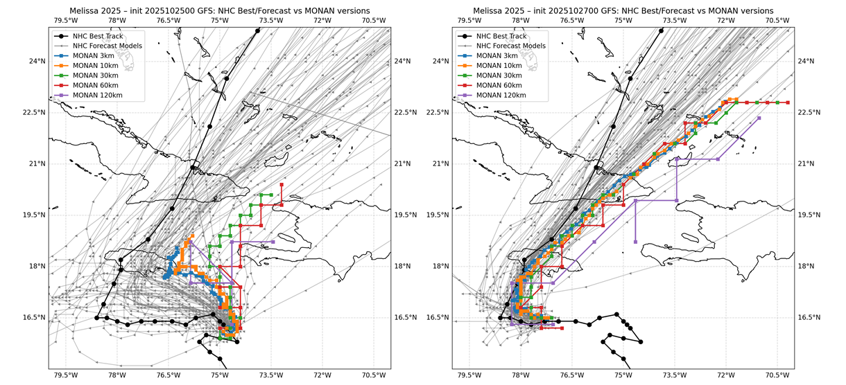 [Link] Trajetória de Melissa simulada pelo MONAN, para as simulações iniciando em 25/10 (esquerda) e 27/10 (direita), em várias resoluções. A linha preta indica a trajetória real estimada pelo Centro Nacional de Furacões (NHC, National Hurricane Center) dos EUA, e as linhas cinzas, os diferentes membros do conjunto de modelos divulgados pelo NHC.O MONAN: um modelo brasileiro para os desafios climáticos do século XXI