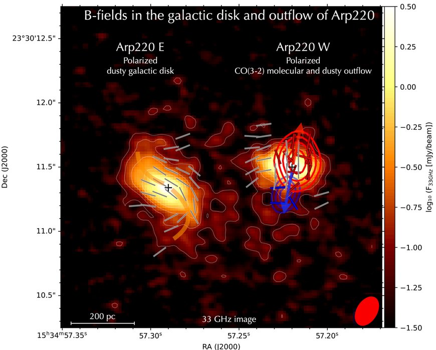 The magnetic fields of the galactic disk and dusty and molecular outflow of the merging galaxy Arp220 observed by ALMA. The magnetically aligned dust grains (grey lines) show a magnetic field parallel to the disk in Arp 220 East, while in Arp 220 West, the magnetic field is parallel to the outflow (red and blue contours) driven by the starburst activity. The CO molecular emission shows a collimated magnetic field (blue and red lines) along the fast molecular outflows of Arp 220 West. Image Credit: Lopez-Rodriguez, E. (USC; polarization data), Girart, J.M. (ICE-CSIC and IEEC; polarization data); (Barcos-Muñoz, L. (NRAO; 3GHz data)