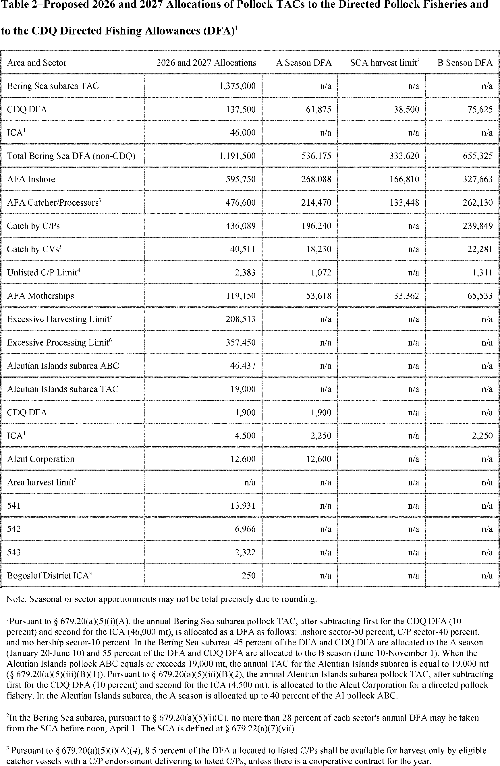 Section 679.20(a)(5)(i)(A) requires that the BS pollock TAC be apportioned as a DFA, after subtracting 10 percent for the CDQ Program and 46,000 mt for the ICA, as follows: 50 percent to the inshore sector, 40 percent to the catcher/processor (C/P) sector, and 10 percent to the mothership sector. In the BS, 45 percent of the DFAs are allocated to the A season (January 20 through June 10), and 55 percent of the DFAs are allocated to the B season (June 10 through November 1) (§§ 679.20(a)(5)(i)(B)( 1 ) and 679.23(e)(2)). The AI directed pollock fishery allocation to the Aleut Corporation is the amount of pollock TAC remaining in the AI, after subtracting 10 percent for the CDQ DFA and 3,000 mt for the ICA (§ 679.20(a)(5)(iii)(B)( 2 )). In the AI, the total A season apportionment of the pollock TAC (including the AI directed fishery allocation, the CDQ DFA, and the ICA) may not exceed 40 percent of the ABC for AI pollock, and the remainder of the pollock TAC is allocated to the B season (§ 679.20(a)(5)(iii)(B)( 3 )). Table 2 lists these proposed 2026 and 2027 amounts. Within any fishing year, any under harvest or over harvest of a seasonal allowance may be added to or subtracted from a subsequent seasonal allowance (§§ 679.20(a)(5)(i)(B)( 2 ) and 679.20(a)(5)(iii)(B)( 3 )( iii )).