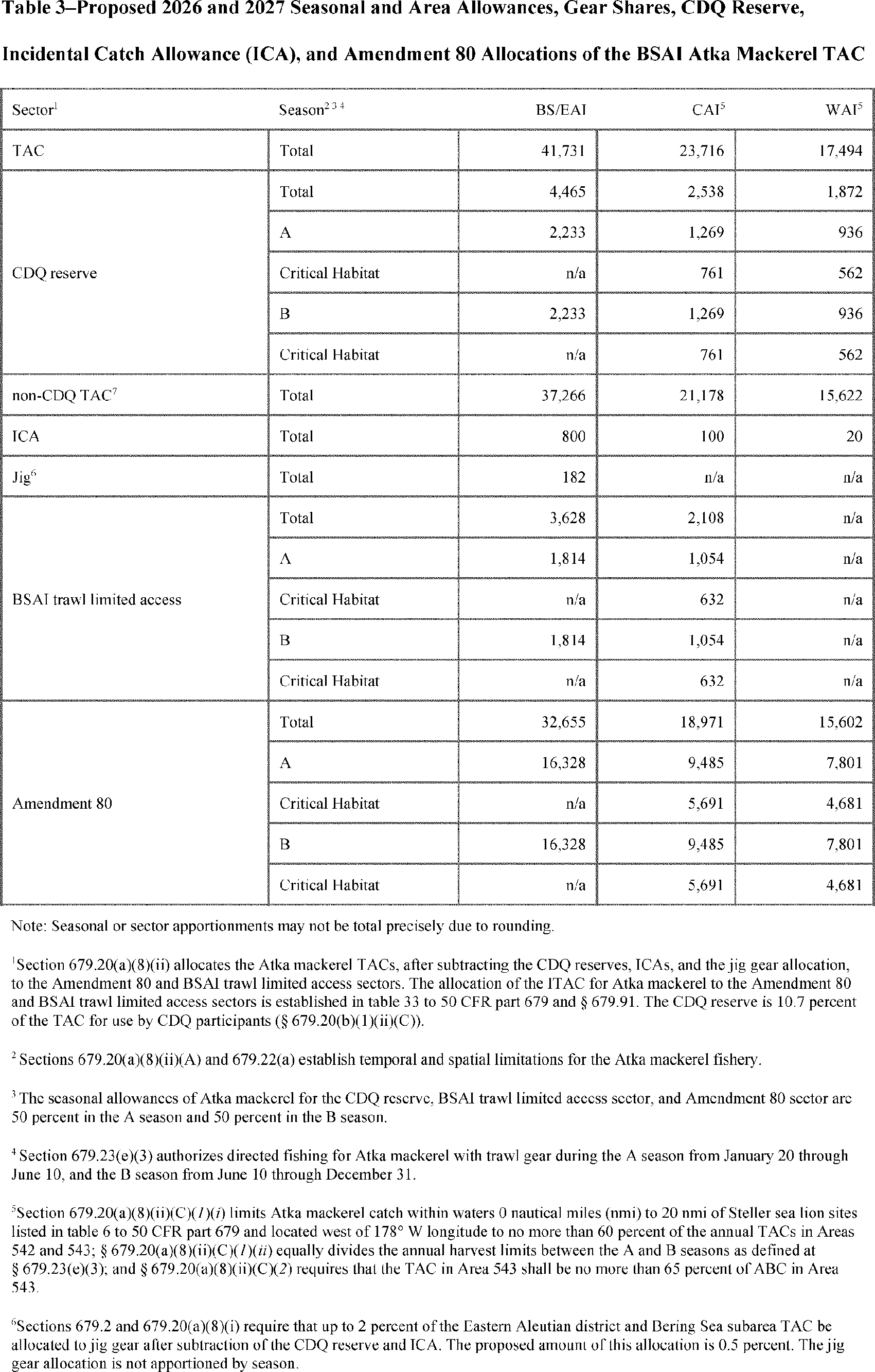 Section 679.20(a)(8) allocates the Atka mackerel TACs to the Amendment 80 and BSAI trawl limited access sectors, after subtracting the CDQ reserves, ICAs for the BSAI trawl limited access sector and non-trawl gear sector, and the jig gear allocation (table 3). The percentage of the ITAC for Atka mackerel allocated to the Amendment 80 and BSAI trawl limited access sectors is listed in table 33 to 50 CFR part 679 and in § 679.91. Pursuant to § 679.20(a)(8)(i), up to 2 percent of the Eastern Aleutian district and BS subarea Atka mackerel TAC may be allocated to vessels using jig gear. The percent of this allocation is recommended annually by the Council based on several criteria, including the anticipated harvest capacity of the jig gear fleet. The Council recommended, and NMFS proposes, a 0.5 percent allocation of the Atka mackerel TAC in the Eastern Aleutian district and BS subarea to the jig sector gear in 2026 and 2027. This allocation, though, may change in the final harvest specifications. At the October Council meeting, the Council indicated that it may recommend at its December Council meeting a zero percent allocation of the Atka mackerel TAC in the Eastern Aleutian district and BS subarea to the jig sector for the final 2026 and 2027 harvest specifications. This is based on the amount of Atka mackerel harvested by vessels using jig gear during recent fishing years; this sector has not utilized any of its allocation in recent years. The Council and NMFS will consider whether to reduce the allocation to zero percent of the Atka mackerel TAC in the Eastern Aleutian district and BS subarea to the jig sector gear for the final 2026 and 2027 harvest specifications, based on factors that include the anticipated harvest, if any, by vessels using jig gear in the upcoming fishing year, and any relevant public comment at the December Council meeting.