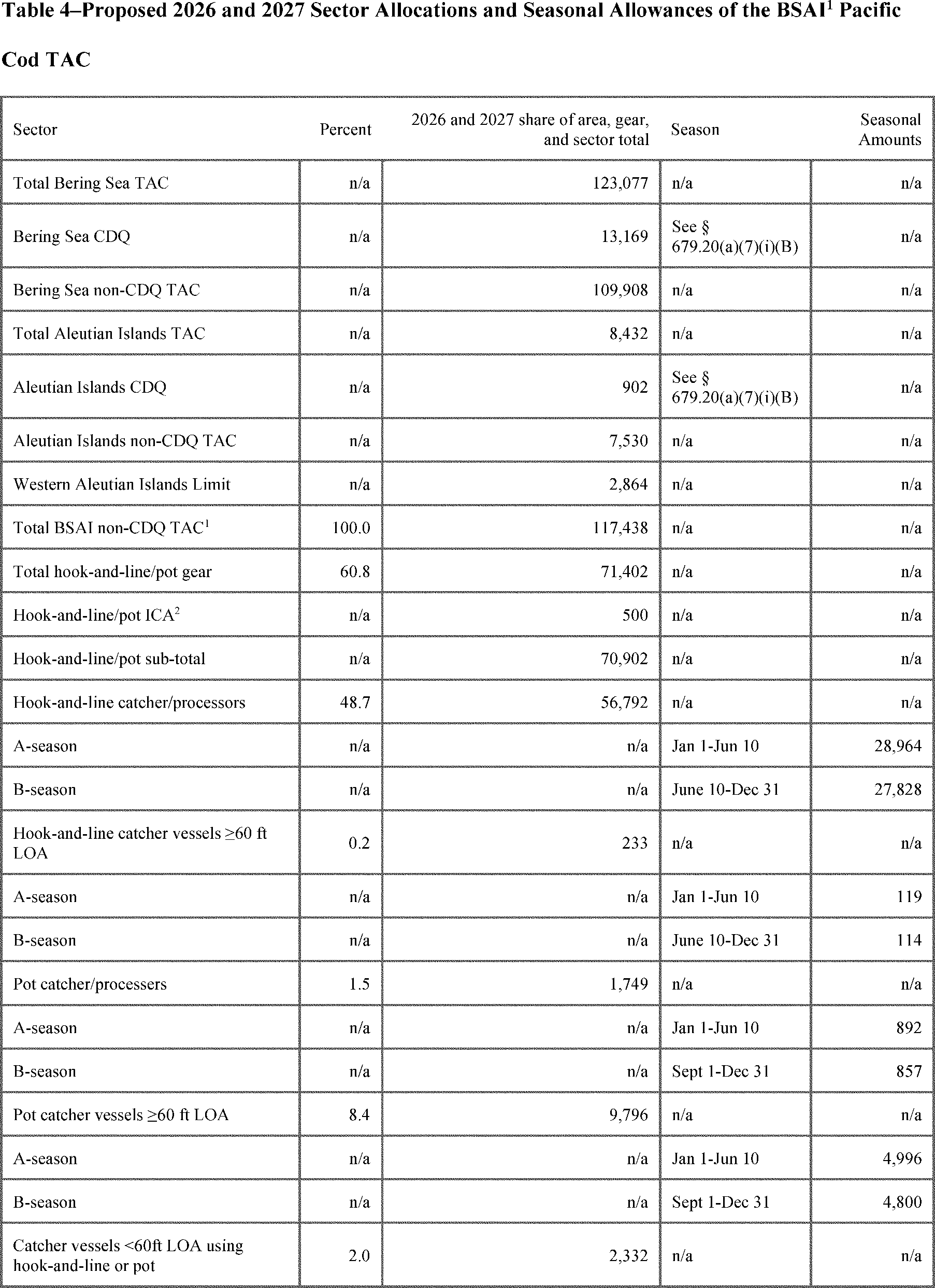 Based on the proposed 2026 and 2027 Pacific cod TACs, table 4 lists the CDQ and non-CDQ TAC amounts; non-CDQ seasonal allowances by gear; the sector allocations of Pacific cod; and the seasons set forth at § 679.23(e)(5).