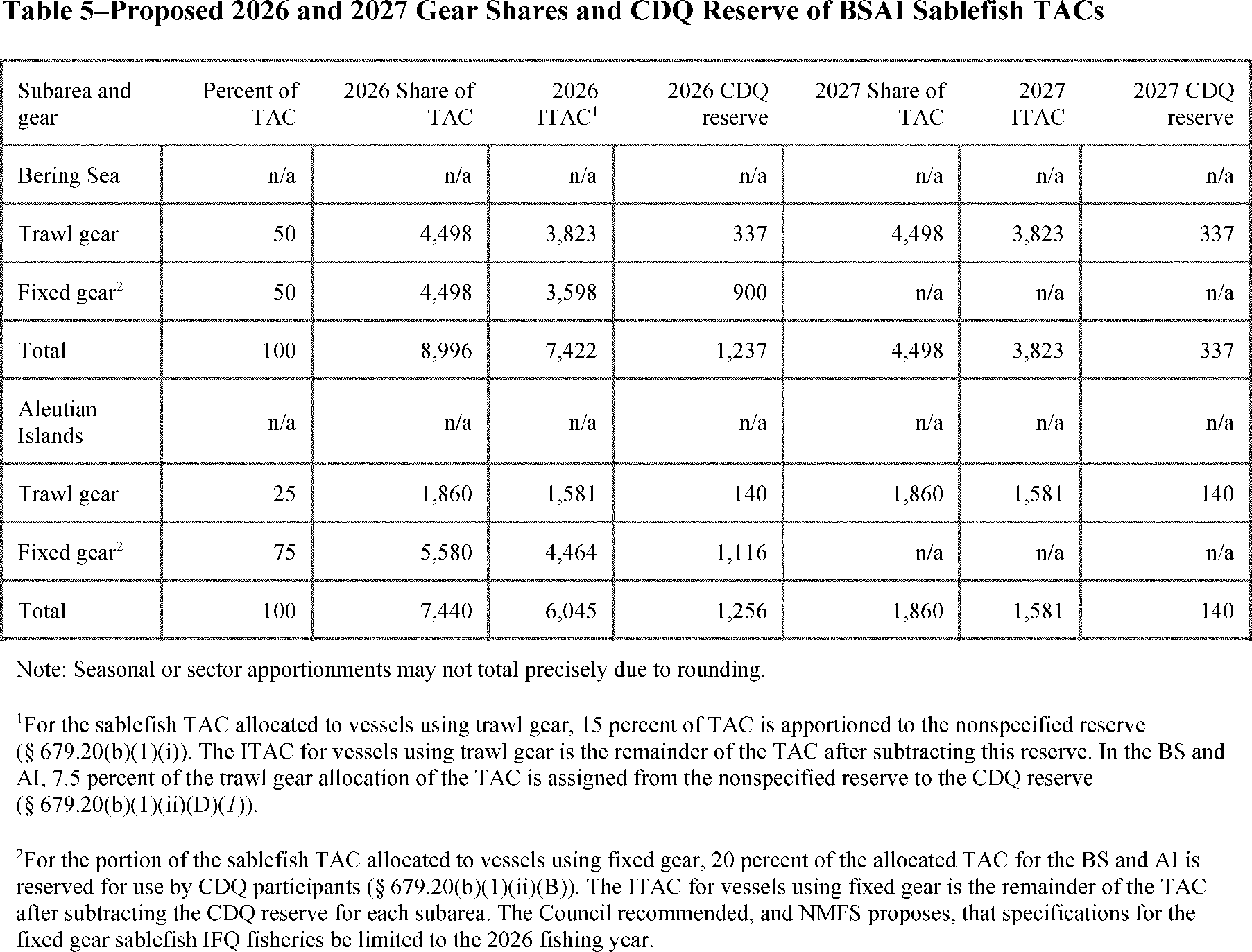 Sections 679.20(a)(4)(iii) and (iv) require allocation of sablefish TAC for the BS and AI between trawl gear and fixed gear. Gear allocations of the sablefish TAC for the BS are 50 percent for trawl gear and 50 percent for fixed gear. Gear allocations of the TAC for the AI are 25 percent for trawl gear and 75 percent for fixed gear. Section 679.20(b)(1)(ii)(B) requires that NMFS apportion 20 percent of the fixed gear allocation of sablefish TAC to the CDQ reserve for each subarea. Also, § 679.20(b)(1)(ii)(D)( 1 ) requires that 7.5 percent of the trawl gear allocation of sablefish TAC from the nonspecified reserve, established under § 679.20(b)(1)(i), be apportioned to the CDQ reserve. The Council recommended and NMFS proposes that only trawl sablefish TAC be established biennially. The harvest specifications for the fixed gear sablefish Individual Fishing Quota (IFQ) fisheries are limited to the 2026 fishing year to ensure those fisheries are conducted concurrently with the halibut IFQ fishery. Concurrent sablefish and halibut IFQ fisheries reduce the potential for discards of halibut and sablefish in those fisheries. The sablefish IFQ fisheries remain closed at the beginning of each fishing year until the final harvest specifications for the sablefish IFQ fisheries are in effect. Table 5 lists the proposed 2026 and 2027 gear allocations of the sablefish TAC and CDQ reserve amounts.