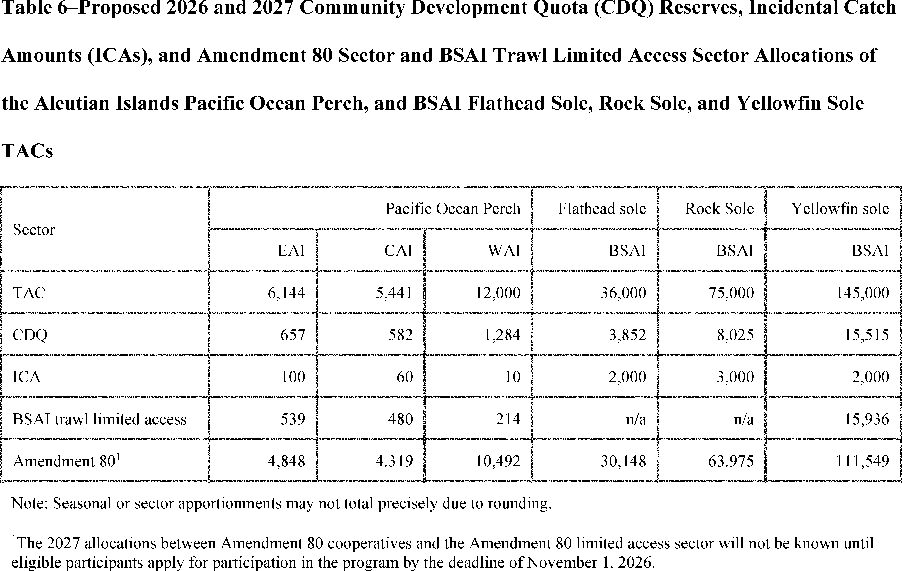 One Amendment 80 cooperative has formed for the 2026 fishing year. Because all Amendment 80 vessels are part of the sole cooperative, no allocation to the Amendment 80 limited access sector is required for 2026. The 2027 allocations for Amendment 80 species between Amendment 80 cooperatives and the Amendment 80 limited access sector will not be known until eligible participants apply for participation in the program by November 1, 2026. Table 6 lists the proposed 2026 and 2027 allocations of the AI Pacific ocean perch, and BSAI flathead sole, rock sole, and yellowfin sole TACs.