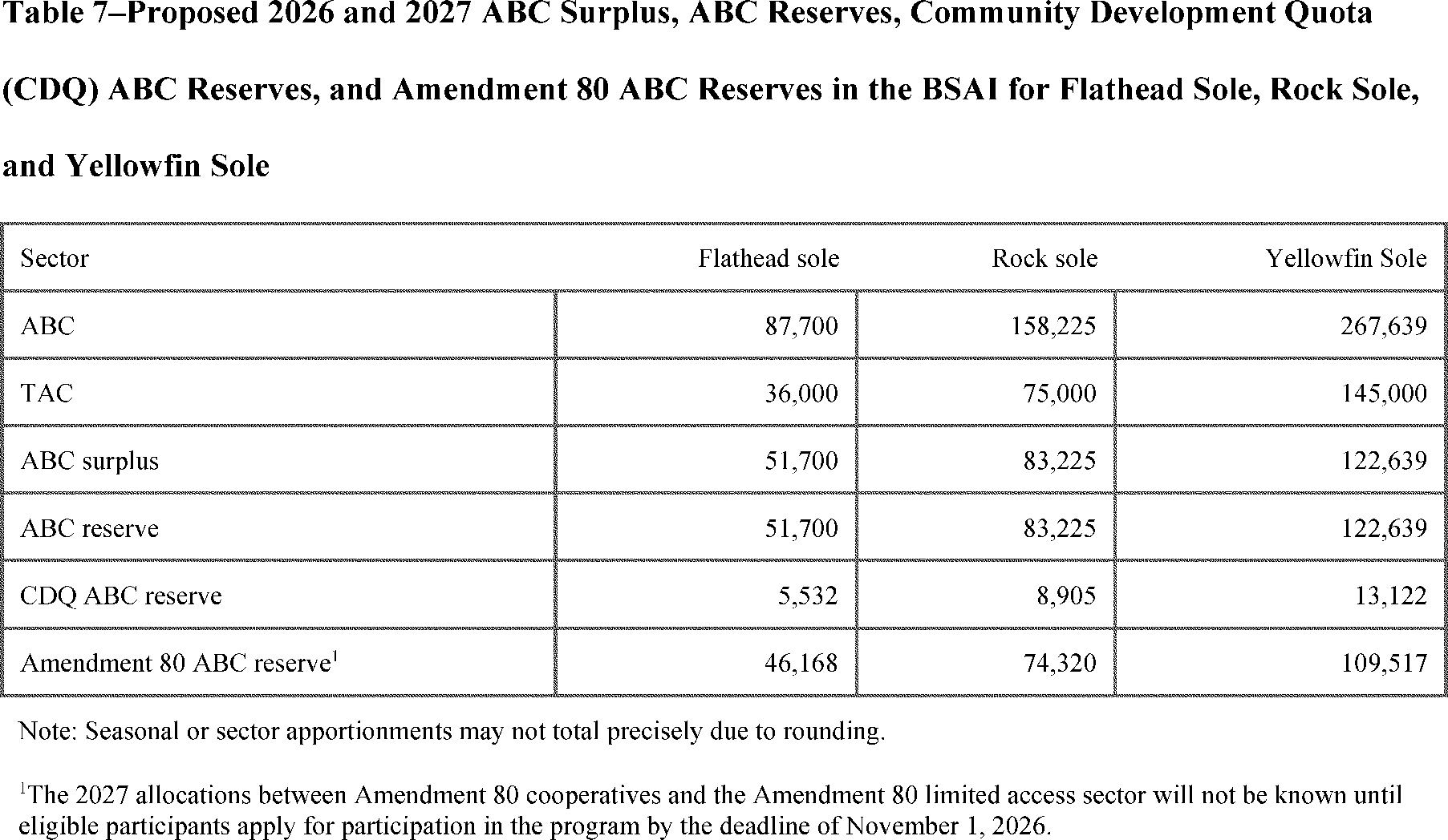 Section 679.2 defines the ABC surplus for flathead sole, rock sole, and yellowfin sole as the difference between the annual ABC and TAC for each species. Section 679.20(b)(1)(iii) establishes ABC reserves for flathead sole, rock sole, and yellowfin sole. The ABC surpluses and the ABC reserves are necessary to mitigate the operational variability, environmental conditions, and economic factors that may constrain the CDQ groups and the Amendment 80 cooperatives from fully harvesting their allocations and to improve the likelihood of achieving and maintaining, on a continuing basis, the OY in the BSAI groundfish fisheries. NMFS, after consultation with the Council, may set the ABC reserve at or below the ABC surplus for each species, thus maintaining the TAC at or below ABC limits. An amount equal to 10.7 percent of the ABC reserves will be allocated as CDQ ABC reserves for flathead sole, rock sole, and yellowfin sole. Section 679.31(b)(4) establishes the annual allocations of CDQ ABC reserves among the CDQ groups. The Amendment 80 ABC reserves are the ABC reserves minus the CDQ ABC reserves. Section 679.91(i)(2) establishes each Amendment 80 cooperative ABC reserves to be the ratio of each cooperatives' quota share units and the total Amendment 80 quota share units, multiplied by the Amendment 80 ABC reserve for each respective species. Table 7 lists the proposed 2026 and 2027 ABC surplus and ABC reserves for BSAI flathead sole, rock sole, and yellowfin sole.