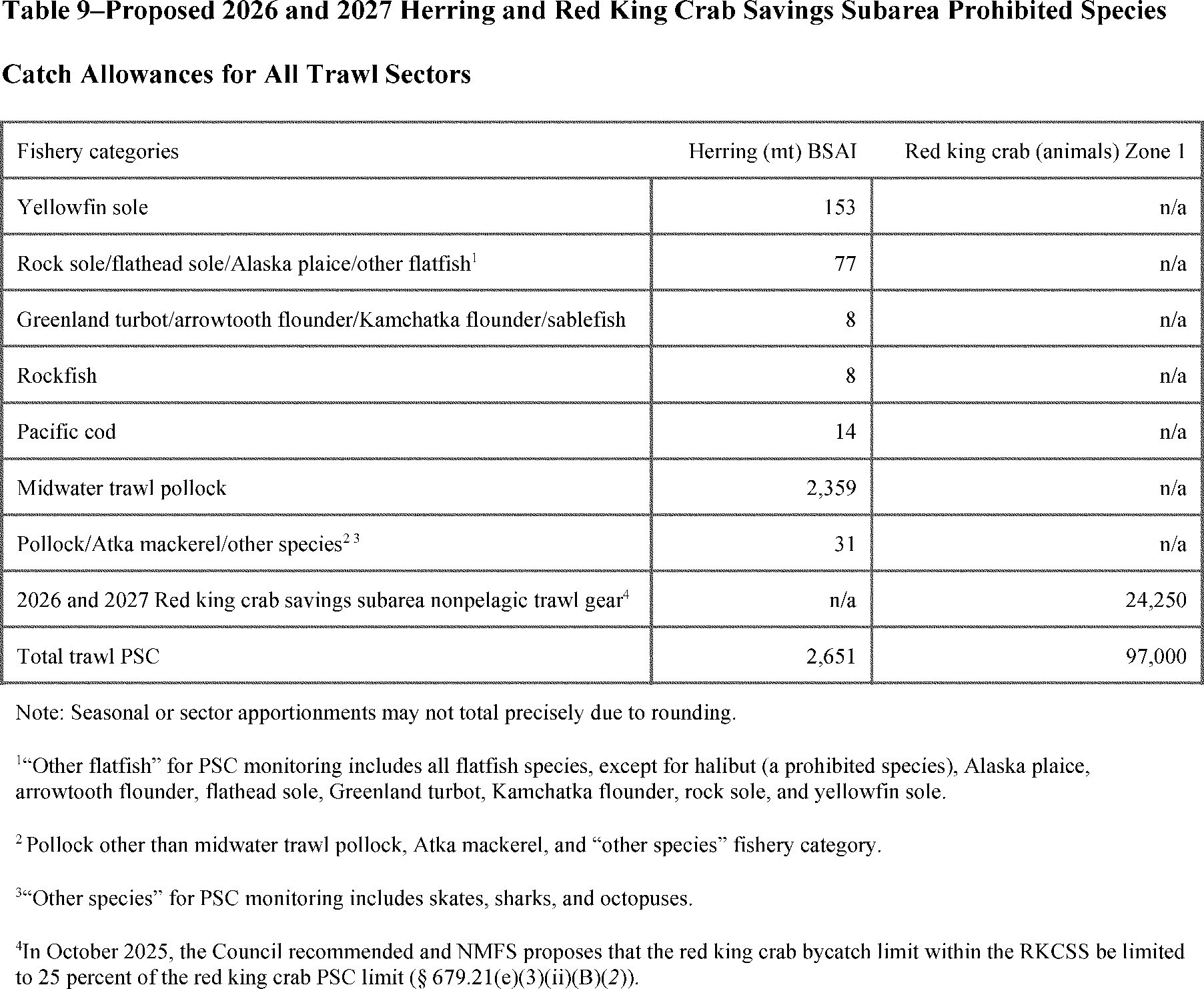 Pursuant to § 679.21(e)(1)(v), the PSC limit of Pacific herring caught while conducting any trawl operation for BSAI groundfish is 1 percent of the annual eastern Bering Sea herring biomass. Due to the lack of new information as of October 2025 regarding herring PSC limits and apportionments, the Council recommended, and NMFS proposes, basing the proposed 2026 and 2027 herring PSC limits and apportionments on the 2025 forecasted biomass estimate. Based on the 2025 forecasted biomass estimate, the best current estimate of 2026 and 2027 herring biomass is 265,096 mt. This amount was developed by the Alaska Department of Fish and Game based on biomass for spawning aggregations. Therefore, the herring PSC limit proposed for 2026 and 2027 is 2,651 mt for all trawl gear as listed in tables 8 and 9. The Council and NMFS will reconsider the herring PSC limit for the final harvest specifications when updated annual survey data and information on biomass becomes available.